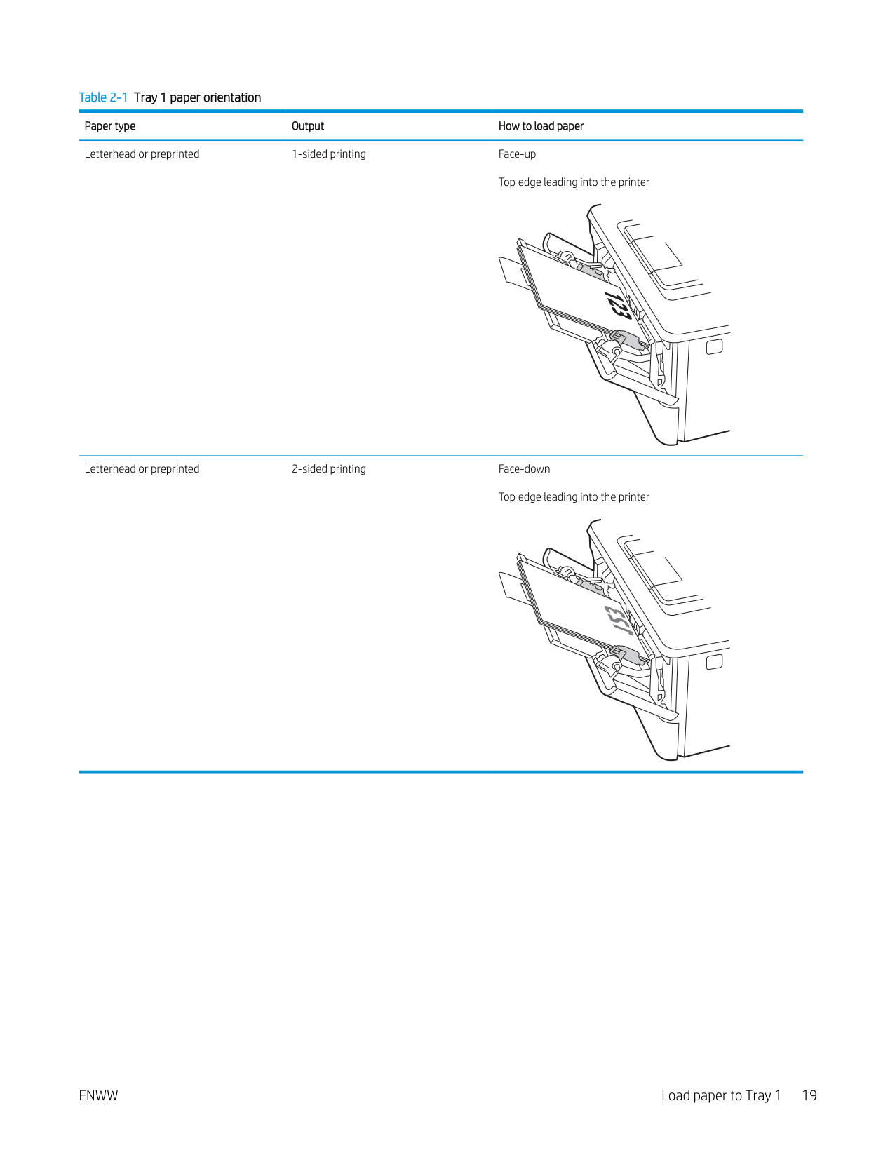 Table 2-1 Tray 1 paper orientation Paper type Output How to load paper Letterhead or preprinted 1-sided printing Face-up Top edge leading into the printer 123 Letterhead or preprinted 2-sided printing Face-down Top edge leading into the printer 123