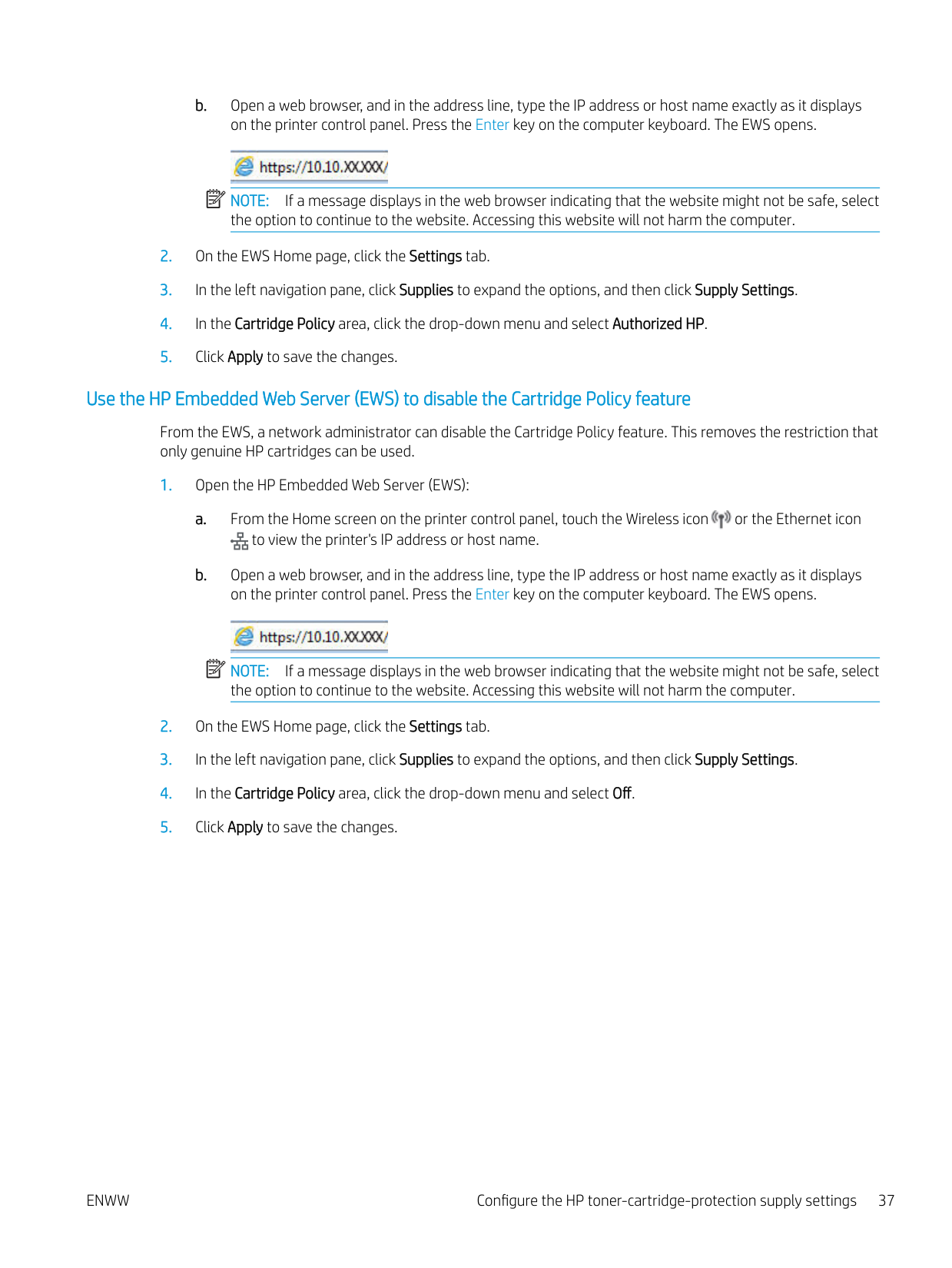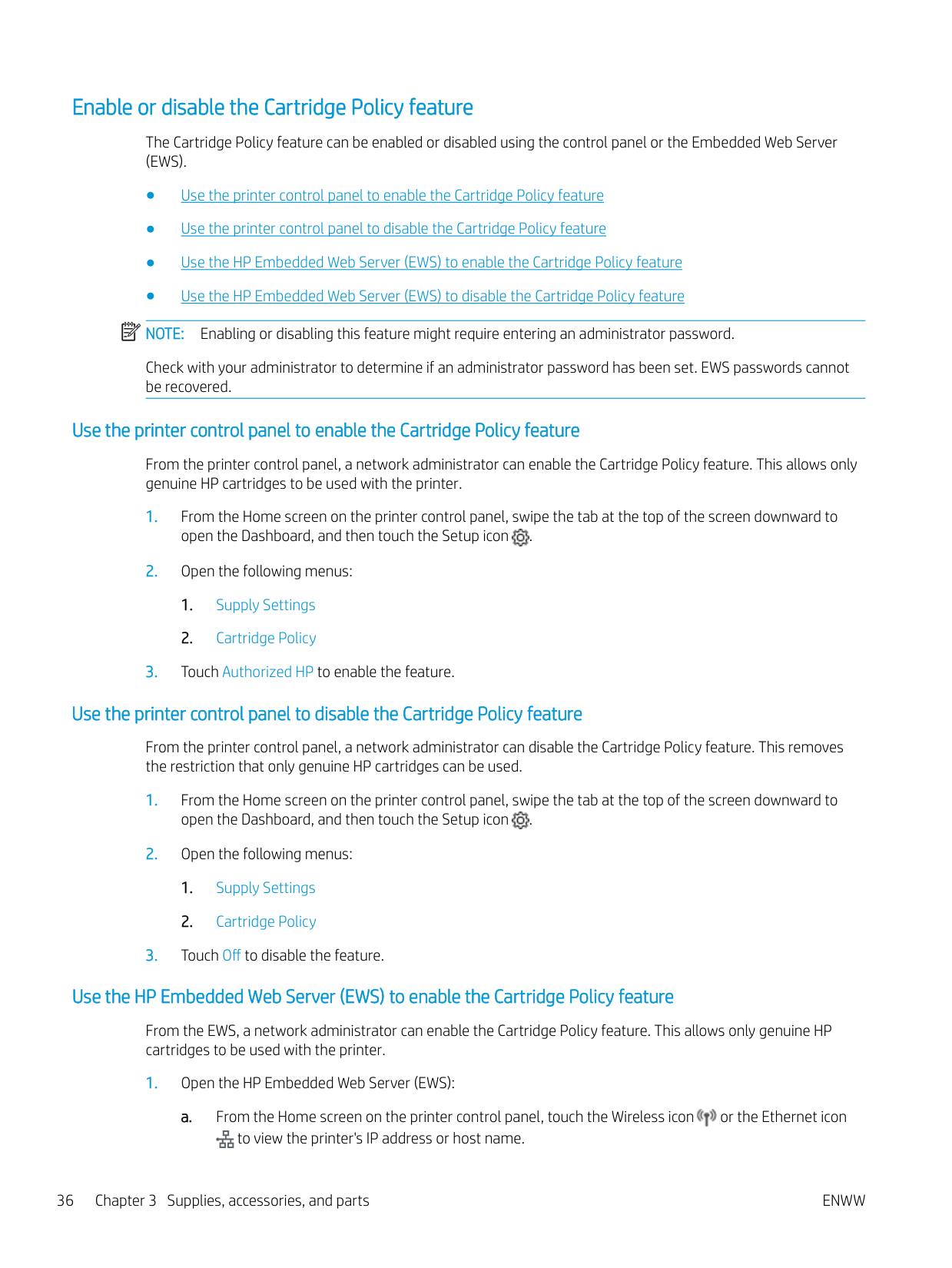 From the printer control panel, go to the Home screen, swipe the tab at the top downward to open the Dashboard, touch the Setup icon, then open Supply Settings and Cartridge Policy menus, and select Authorized HP to enable the feature. Alternatively, use the HP Embedded Web Server by navigating to Settings > Supplies > Supply Settings and selecting Authorized HP from the Cartridge Policy dropdown. (Page 36)