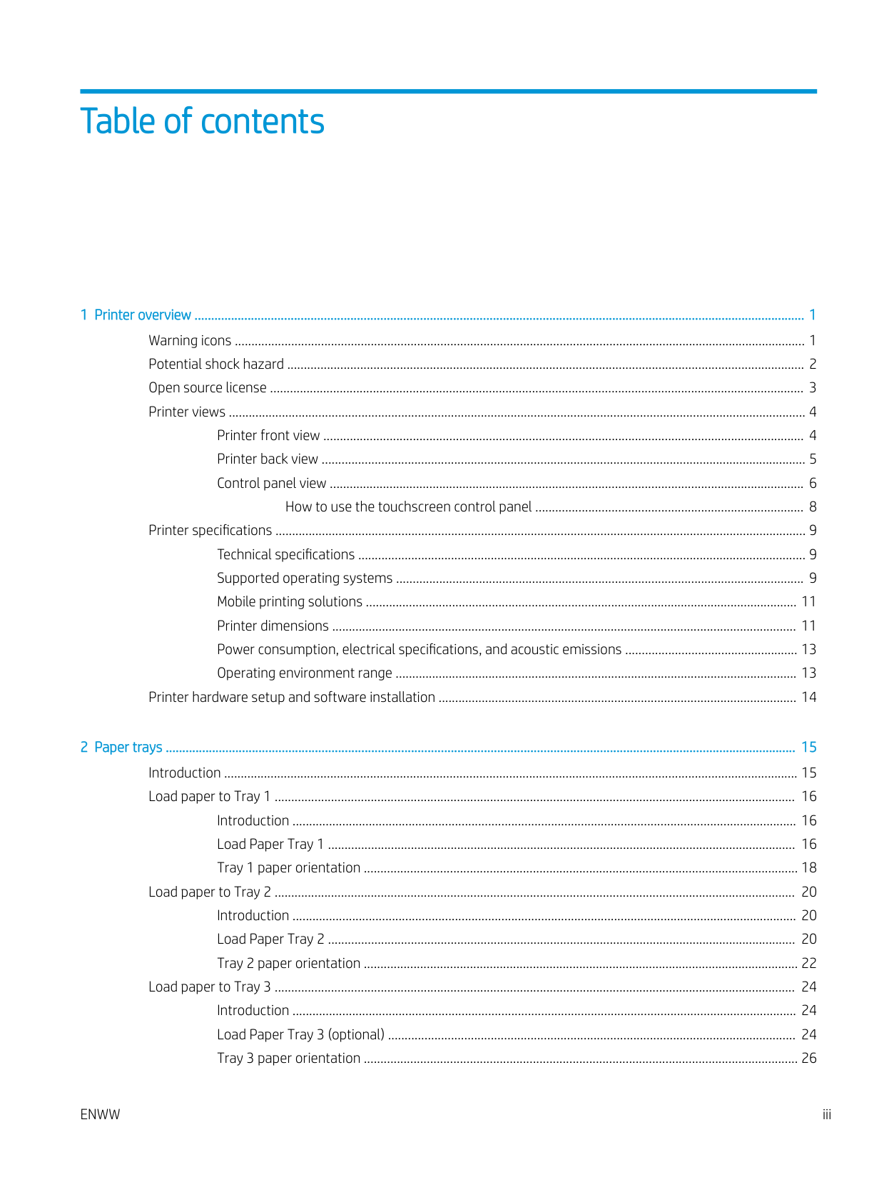 Reproduction, adaptation, or translation without prior written permission is prohibited, except as allowed under the copyright laws. The information contained herein is subject to change without notice. The only warranties for HP products and services are set forth in the express warranty statements accompanying such products and services. Nothing herein should be construed as constituting an additional warranty. HP shall not be liable for technical or editorial errors or omissions contained herein. Edition 2, 8/2019 Trademark Credits Adobe®, Adobe Photoshop®, Acrobat®, and PostScript® are trademarks of Adobe Systems Incorporated. Apple and the Apple logo are trademarks of Apple Inc., registered in the U.S. and other countries. macOS is a trademark of Apple Inc., registered in the U.S. and other countries. AirPrint is a trademark of Apple Inc., registered in the U.S. and other countries. Google™ is a trademark of Google Inc. Microsoft®, Windows®, Windows® XP, and Windows Vista® are U.S. registered trademarks of Microsoft Corporation. UNIX® is a registered trademark of The Open Group.Table of contents 1 Printer overview ........................................................................................................................................................................................ 1 Warning icons ............................................................................................................................................................................ 1 Potential shock hazard ............................................................................................................................................................ 2 Open source license ................................................................................................................................................................. 3 Printer views .............................................................................................................................................................................. 4 Printer front view ................................................................................................................................................. 4 Printer back view .................................................................................................................................................. 5 Control panel view ............................................................................................................................................... 6 How to use the touchscreen control panel ................................................................................. 8 Printer specifications ................................................................................................................................................................ 9 Technical specifications ....................................................................................................................................... 9 Supported operating systems ........................................................................................................................... 9 Mobile printing solutions .................................................................................................................................. 11 Printer dimensions ............................................................................................................................................ 11 Power consumption, electrical specifications, and acoustic emissions .................................................... 13 Operating environment range ......................................................................................................................... 13 Printer hardware setup and software installation ............................................................................................................ 14 2 Paper trays .............................................................................................................................................................................................. 15 Introduction ............................................................................................................................................................................. 15 Load paper to Tray 1 ............................................................................................................................................................. 16 Introduction ........................................................................................................................................................ 16 Load Paper Tray 1 ............................................................................................................................................. 16 Tray 1 paper orientation ................................................................................................................................... 18 Load paper to Tray 2 ............................................................................................................................................................. 20 Introduction ........................................................................................................................................................ 20 Load Paper Tray 2 ............................................................................................................................................. 20 Tray 2 paper orientation ................................................................................................................................... 22 Load paper to Tray 3 ............................................................................................................................................................. 24 Introduction .........................................................................................