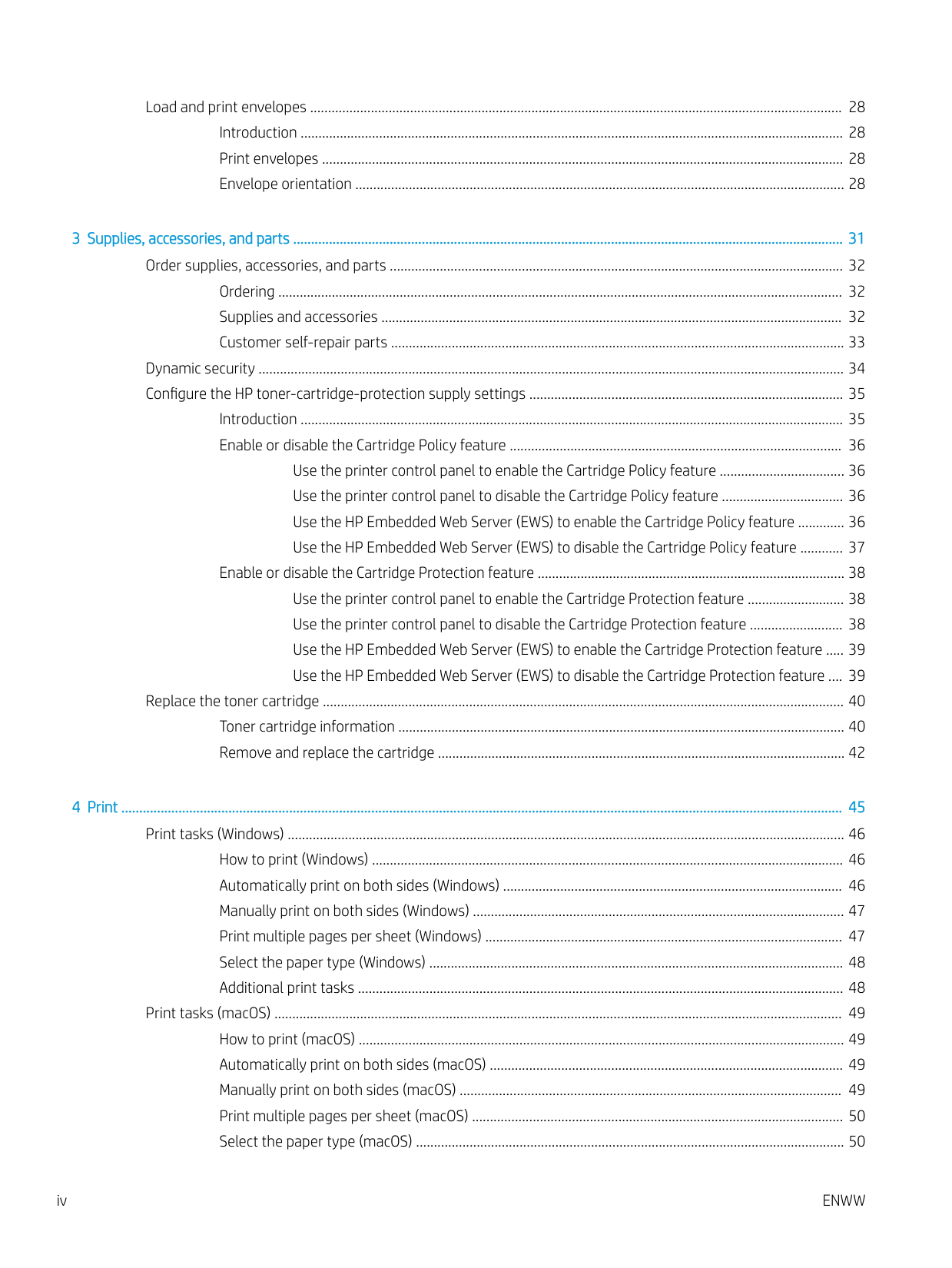 iiiLoad and print envelopes ..................................................................................................................................................... 28 Introduction ........................................................................................................................................................ 28 Print envelopes .................................................................................................................................................. 28 Envelope orientation ......................................................................................................................................... 28 3 Supplies, accessories, and parts .......................................................................................................................................................... 31 Order supplies, accessories, and parts ............................................................................................................................... 32 Ordering .............................................................................................................................................................. 32 Supplies and accessories ................................................................................................................................. 32 Customer self-repair parts ............................................................................................................................... 33 Dynamic security .................................................................................................................................................................... 34 Configure the HP toner-cartridge-protection supply settings ........................................................................................ 35 Introduction ........................................................................................................................................................ 35 Enable or disable the Cartridge Policy feature ............................................................................................. 36 Use the printer control panel to enable the Cartridge Policy feature ................................... 36 Use the printer control panel to disable the Cartridge Policy feature .................................. 36 Use the HP Embedded Web Server (EWS) to enable the Cartridge Policy feature ............. 36 Use the HP Embedded Web Server (EWS) to disable the Cartridge Policy feature ............ 37 Enable or disable the Cartridge Protection feature ...................................................................................... 38 Use the printer control panel to enable the Cartridge Protection feature ........................... 38 Use the printer control panel to disable the Cartridge Protection feature .......................... 38 Use the HP Embedded Web Server (EWS) to enable the Cartridge Protection feature ..... 39 Use the HP Embedded Web Server (EWS) to disable the Cartridge Protection feature .... 39 Replace the toner cartridge .................................................................................................................................................. 40 Toner cartridge information ............................................................................................................................. 40 Remove and replace the cartridge .................................................................................................................. 42 4 Print .......................................................................................................................................................................................................... 45 Print tasks (Windows) ............................................................................................................................................................ 46 How to print (Windows) .................................................................................................................................... 46 Automatically print on both sides (Windows) ............................................................................................... 46 Manually print on both sides (Windows) ........................................................................................................ 47 Print multiple pages per sheet (Windows) .................................................................................................... 47 Select the paper type (Windows) .................................................................................................................... 48 Additional print tasks ........................................................................................................................................ 48 Print tasks (macOS) ............................................................................................................................................................... 49 How to print (macOS) ........................................................................................................................................ 49 Automatically print on both sides (macOS) ................................................................................................... 49 Manually print on both sides (macOS) ........................................................................................................... 49 Print multiple pages per sheet (macOS) ........................................................................................................ 50 Select the paper type (macOS) ........................................................................................................................ 50 iv