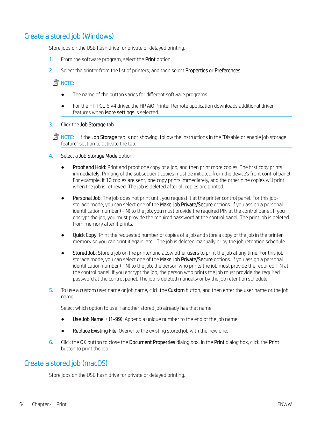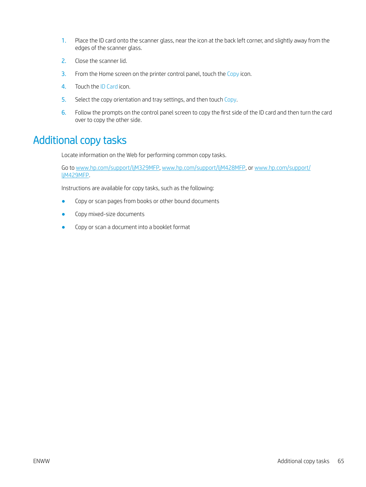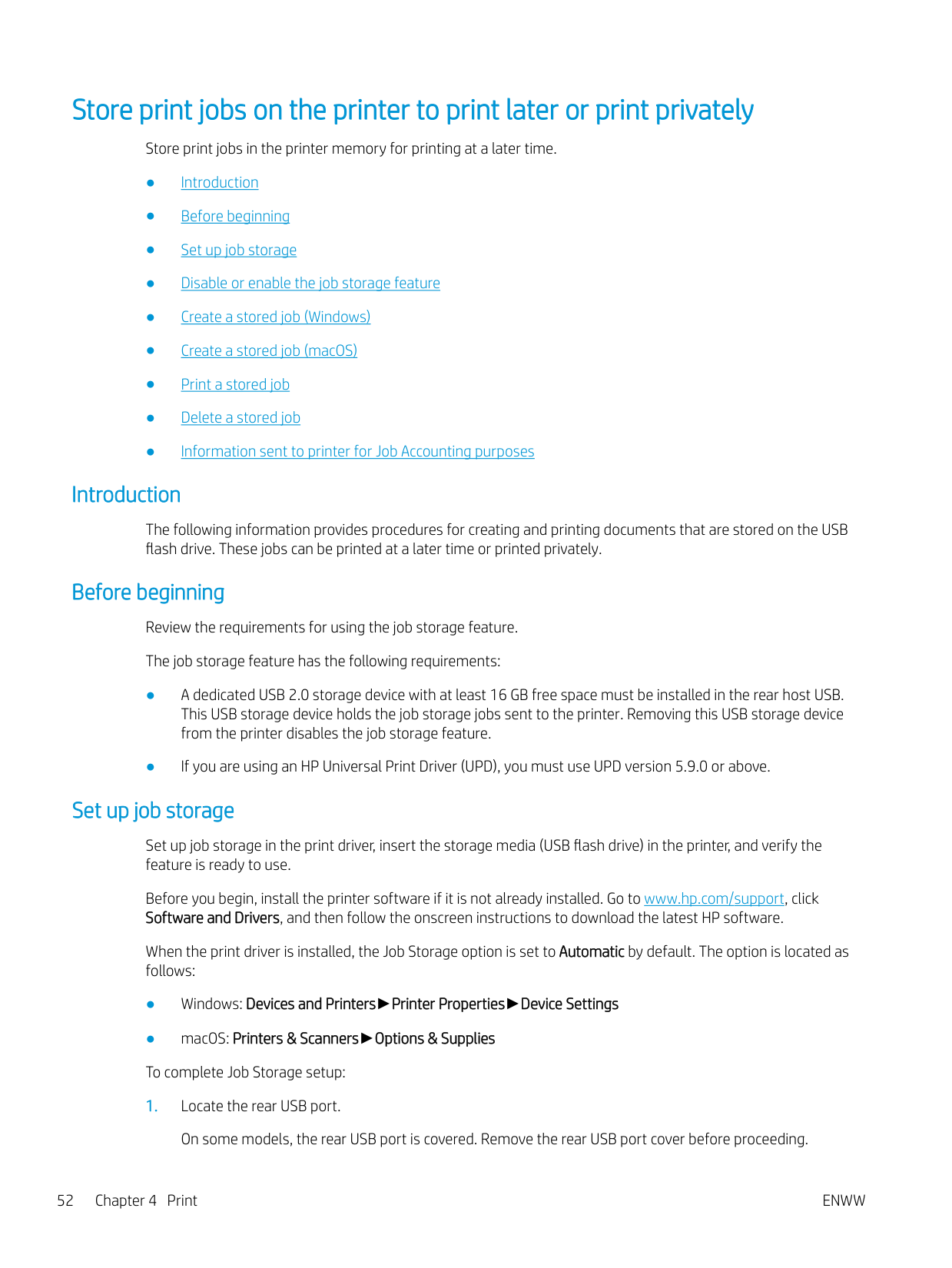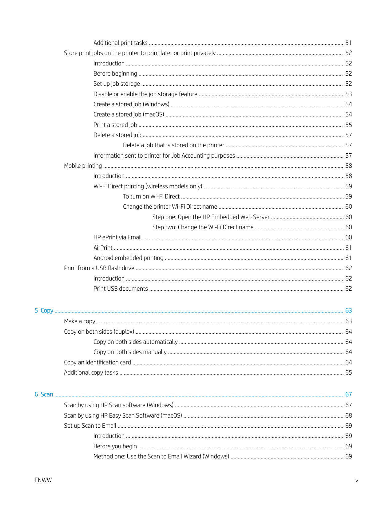 Additional print tasks ........................................................................................................................................ 51 Store print jobs on the printer to print later or print privately ........................................................................................ 52 Introduction ........................................................................................................................................................ 52 Before beginning ............................................................................................................................................... 52 Set up job storage ............................................................................................................................................. 52 Disable or enable the job storage feature ..................................................................................................... 53 Create a stored job (Windows) ......................................................................................................................... 54 Create a stored job (macOS) ............................................................................................................................ 54 Print a stored job ............................................................................................................................................... 55 Delete a stored job ............................................................................................................................................ 57 Delete a job that is stored on the printer .................................................................................. 57 Information sent to printer for Job Accounting purposes ........................................................................... 57 Mobile printing ........................................................................................................................................................................ 58 Introduction ........................................................................................................................................................ 58 Wi-Fi Direct printing (wireless models only) .................................................................................................. 59 To turn on Wi-Fi Direct .................................................................................................................. 59 Change the printer Wi-Fi Direct name ....................................................................................... 60 Step one: Open the HP Embedded Web Server ................................................... 60 Step two: Change the Wi-Fi Direct name .............................................................. 60 HP ePrint via Email ............................................................................................................................................ 60 AirPrint ................................................................................................................................................................. 61 Android embedded printing ............................................................................................................................. 61 Print from a USB flash drive ................................................................................................................................................. 62 Introduction ........................................................................................................................................................ 62 Print USB documents ........................................................................................................................................ 62 5 Copy .......................................................................................................................................................................................................... 63 Make a copy ............................................................................................................................................................................. 63 Copy on both sides (duplex) ................................................................................................................................................. 64 Copy on both sides automatically ................................................................................................................... 64 Copy on both sides manually ........................................................................................................................... 64 Copy an identification card .................................................................................................................................................... 64 Additional copy tasks ............................................................................................................................................................. 65 6 Scan .......................................................................................................................................................................................................... 67 Scan by using HP Scan software (Windows) ...................................................................................................................... 67 Scan by using HP Easy Scan Software (macOS) ................................................................................................................ 68 Set up Scan to Email .............................................................................................................................................................. 69 Introduction ........................................................................................................................................................ 69 Before you begin 