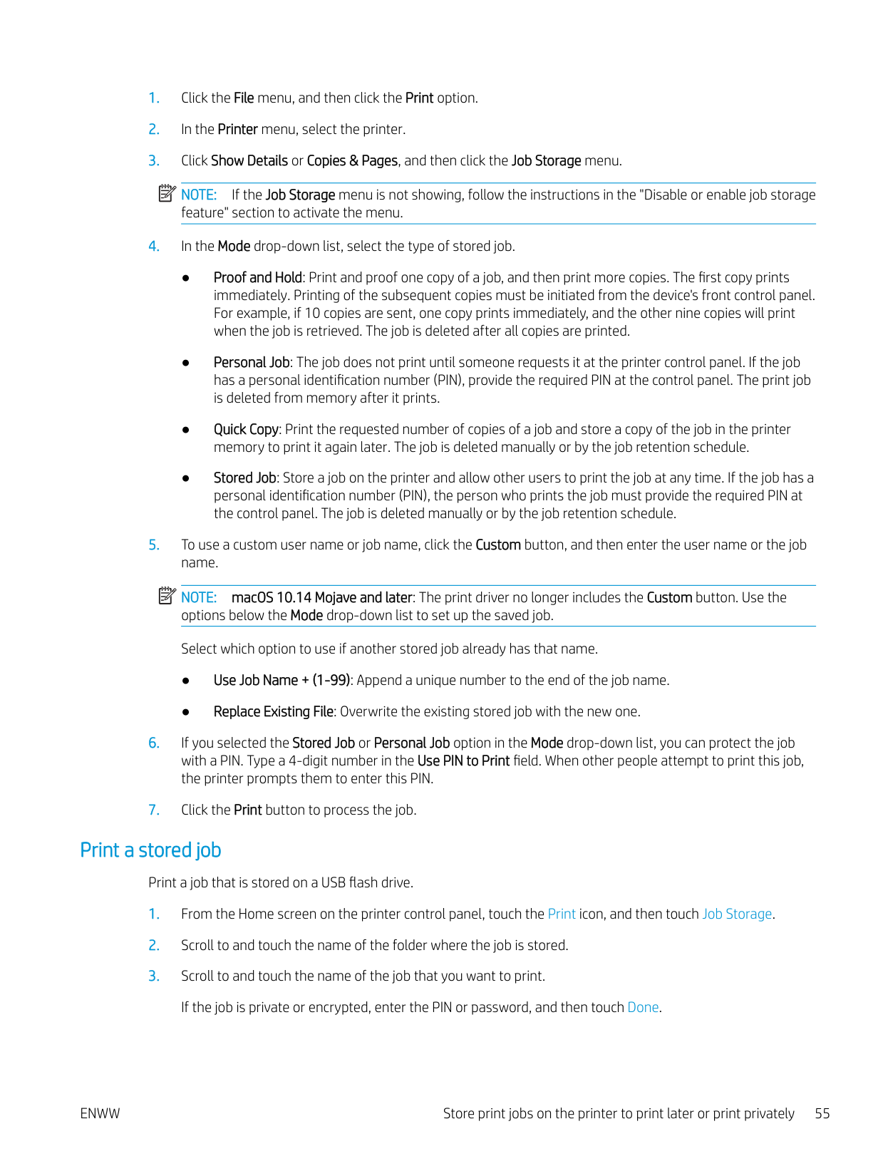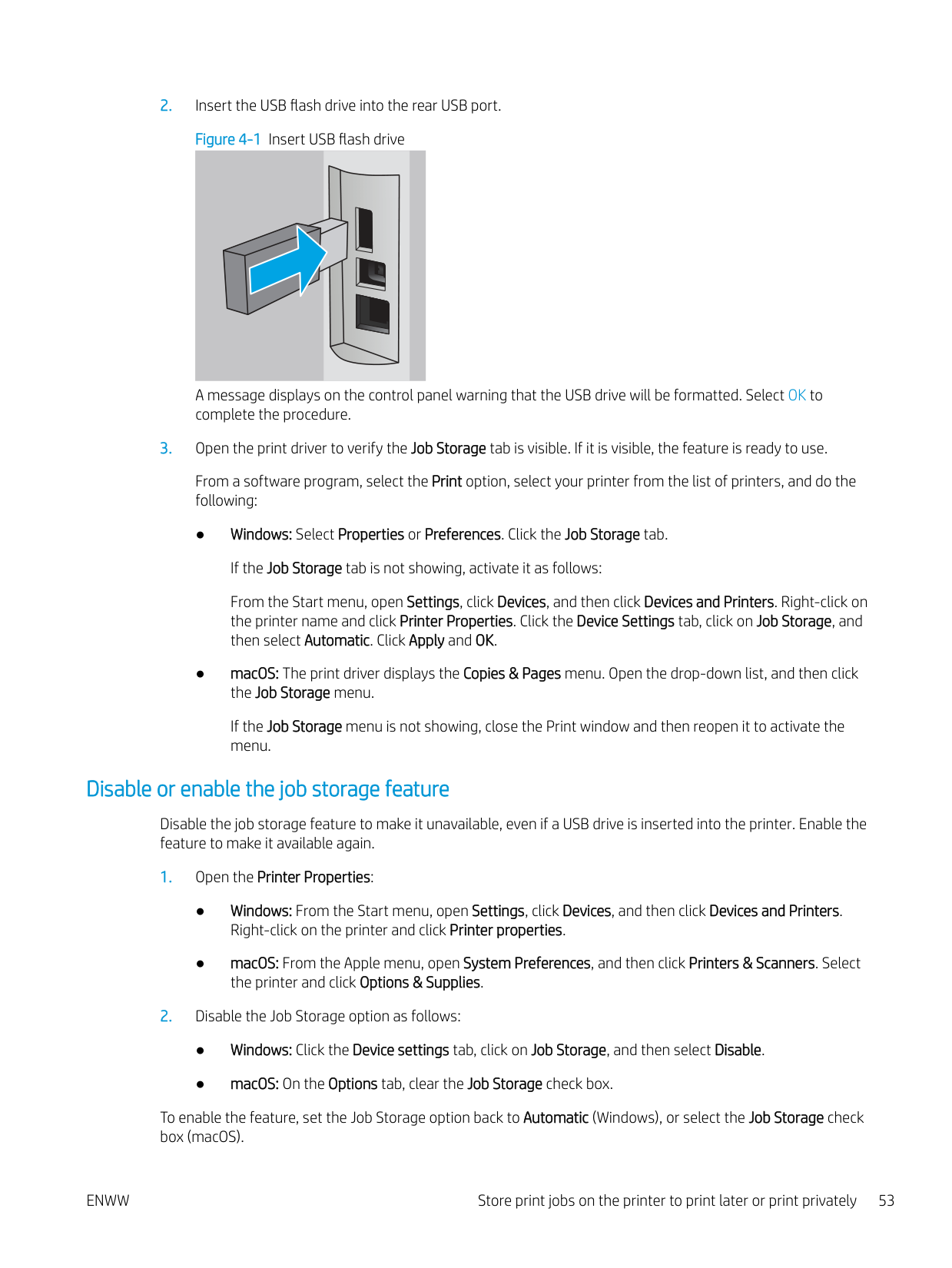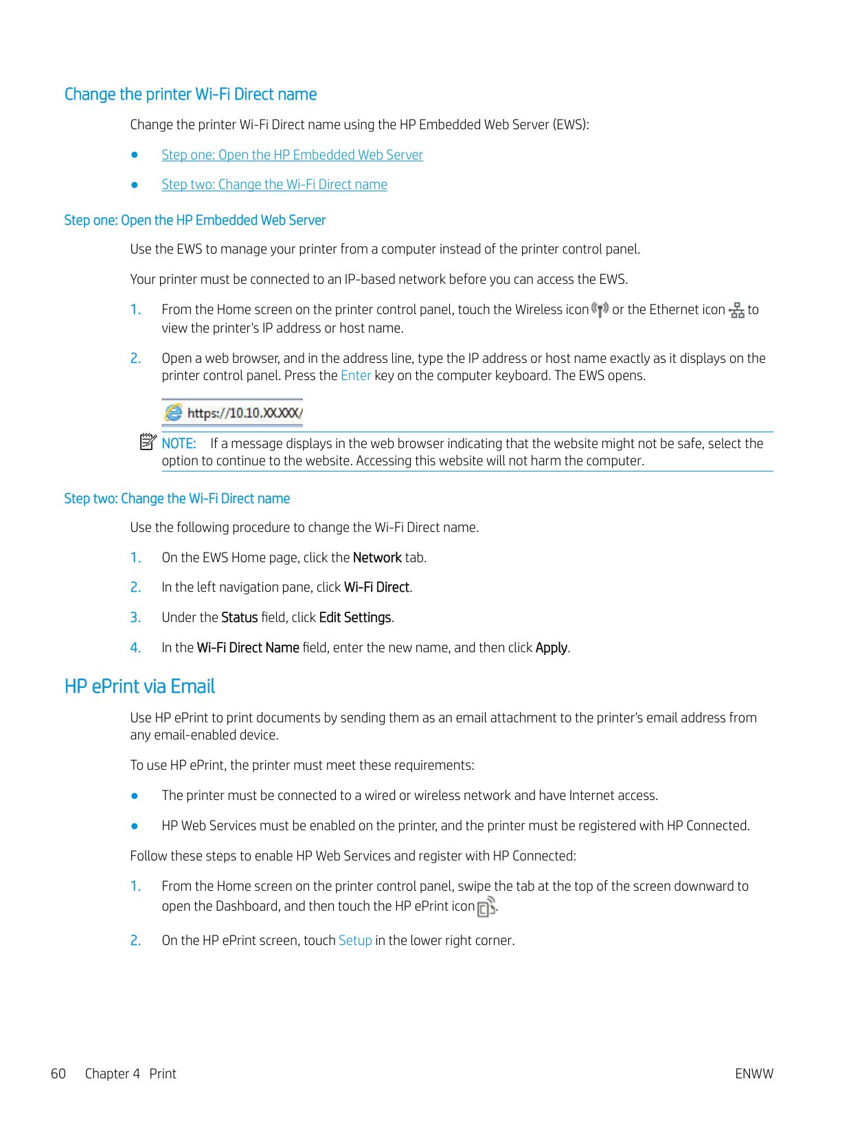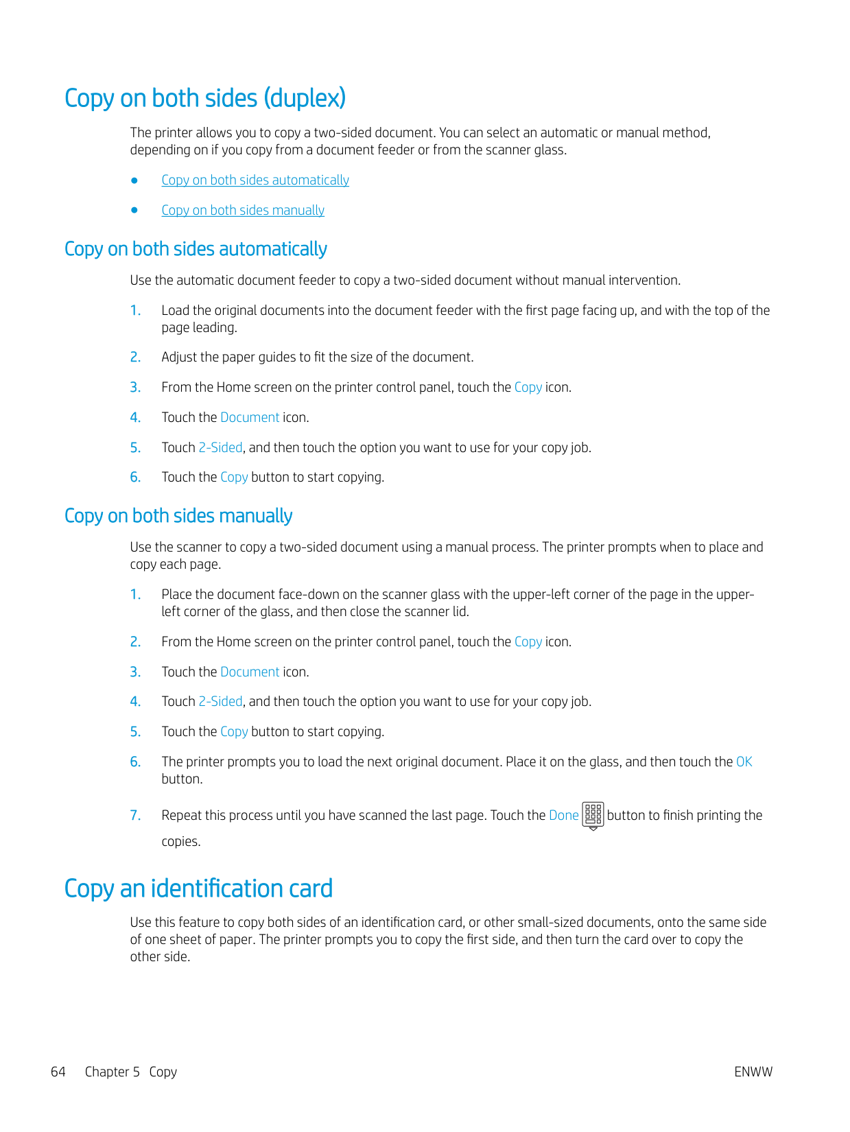 Additional print tasks ........................................................................................................................................ 51 Store print jobs on the printer to print later or print privately ........................................................................................ 52 Introduction ........................................................................................................................................................ 52 Before beginning ............................................................................................................................................... 52 Set up job storage ............................................................................................................................................. 52 Disable or enable the job storage feature ..................................................................................................... 53 Create a stored job (Windows) ......................................................................................................................... 54 Create a stored job (macOS) ............................................................................................................................ 54 Print a stored job ............................................................................................................................................... 55 Delete a stored job ............................................................................................................................................ 57 Delete a job that is stored on the printer .................................................................................. 57 Information sent to printer for Job Accounting purposes ........................................................................... 57 Mobile printing ........................................................................................................................................................................ 58 Introduction ........................................................................................................................................................ 58 Wi-Fi Direct printing (wireless models only) .................................................................................................. 59 To turn on Wi-Fi Direct .................................................................................................................. 59 Change the printer Wi-Fi Direct name ....................................................................................... 60 Step one: Open the HP Embedded Web Server ................................................... 60 Step two: Change the Wi-Fi Direct name .............................................................. 60 HP ePrint via Email ............................................................................................................................................ 60 AirPrint ................................................................................................................................................................. 61 Android embedded printing ............................................................................................................................. 61 Print from a USB flash drive ................................................................................................................................................. 62 Introduction ........................................................................................................................................................ 62 Print USB documents ........................................................................................................................................ 62 5 Copy .......................................................................................................................................................................................................... 63 Make a copy ............................................................................................................................................................................. 63 Copy on both sides (duplex) ................................................................................................................................................. 64 Copy on both sides automatically ................................................................................................................... 64 Copy on both sides manually ........................................................................................................................... 64 Copy an identification card .................................................................................................................................................... 64 Additional copy tasks ............................................................................................................................................................. 65 6 Scan .......................................................................................................................................................................................................... 67 Scan by using HP Scan software (Windows) ...................................................................................................................... 67 Scan by using HP Easy Scan Software (macOS) ................................................................................................................ 68 Set up Scan to Email .............................................................................................................................................................. 69 Introduction ........................................................................................................................................................ 69 Before you begin 