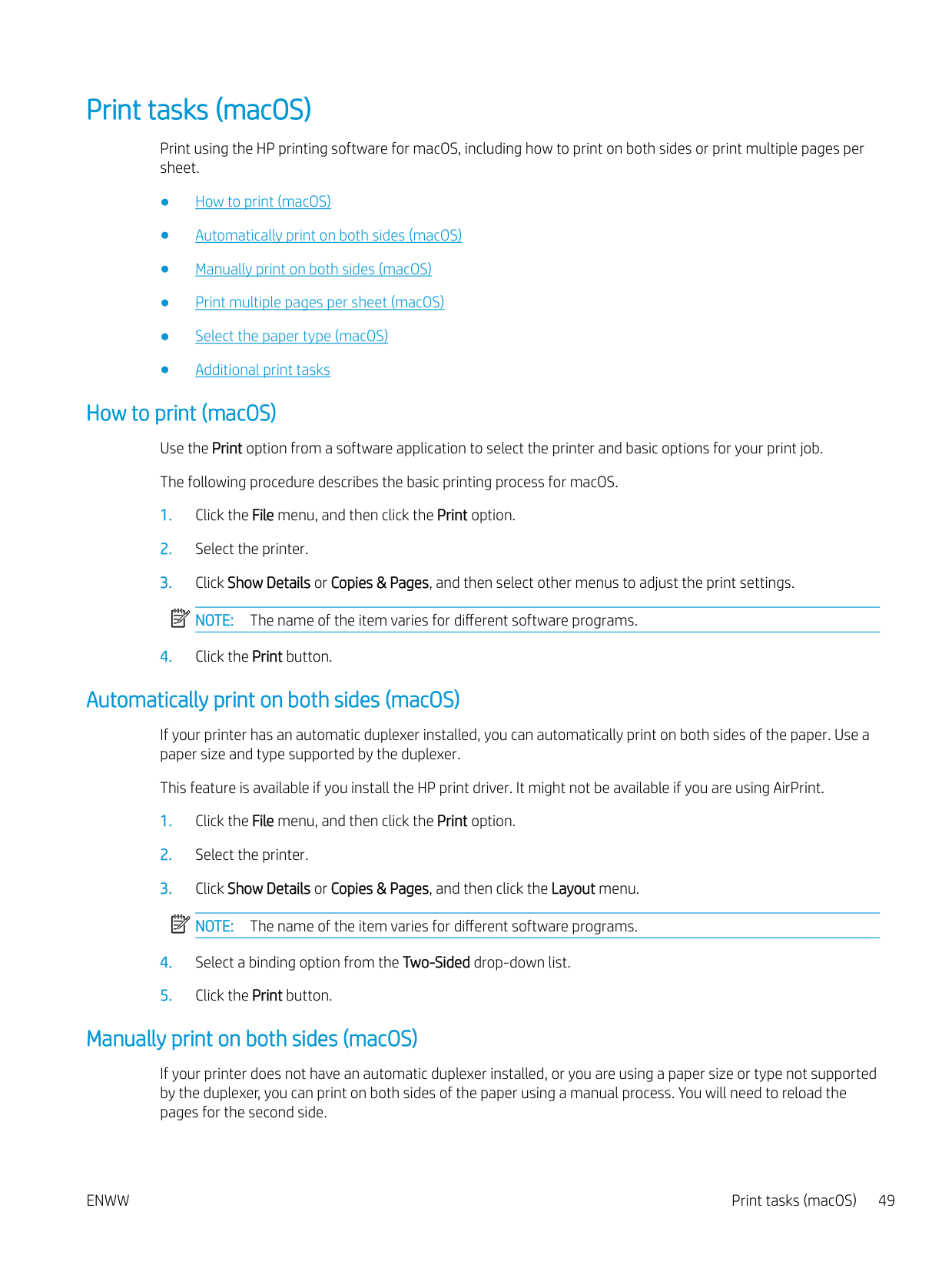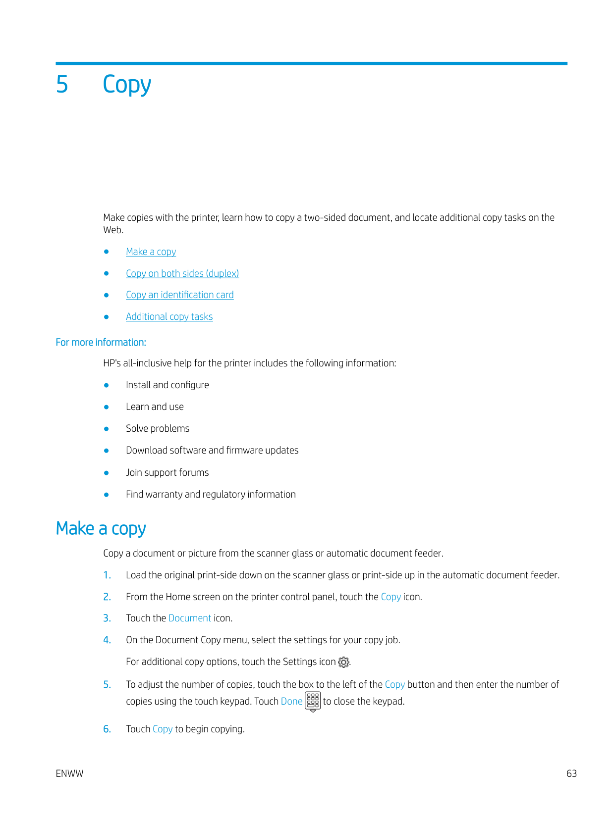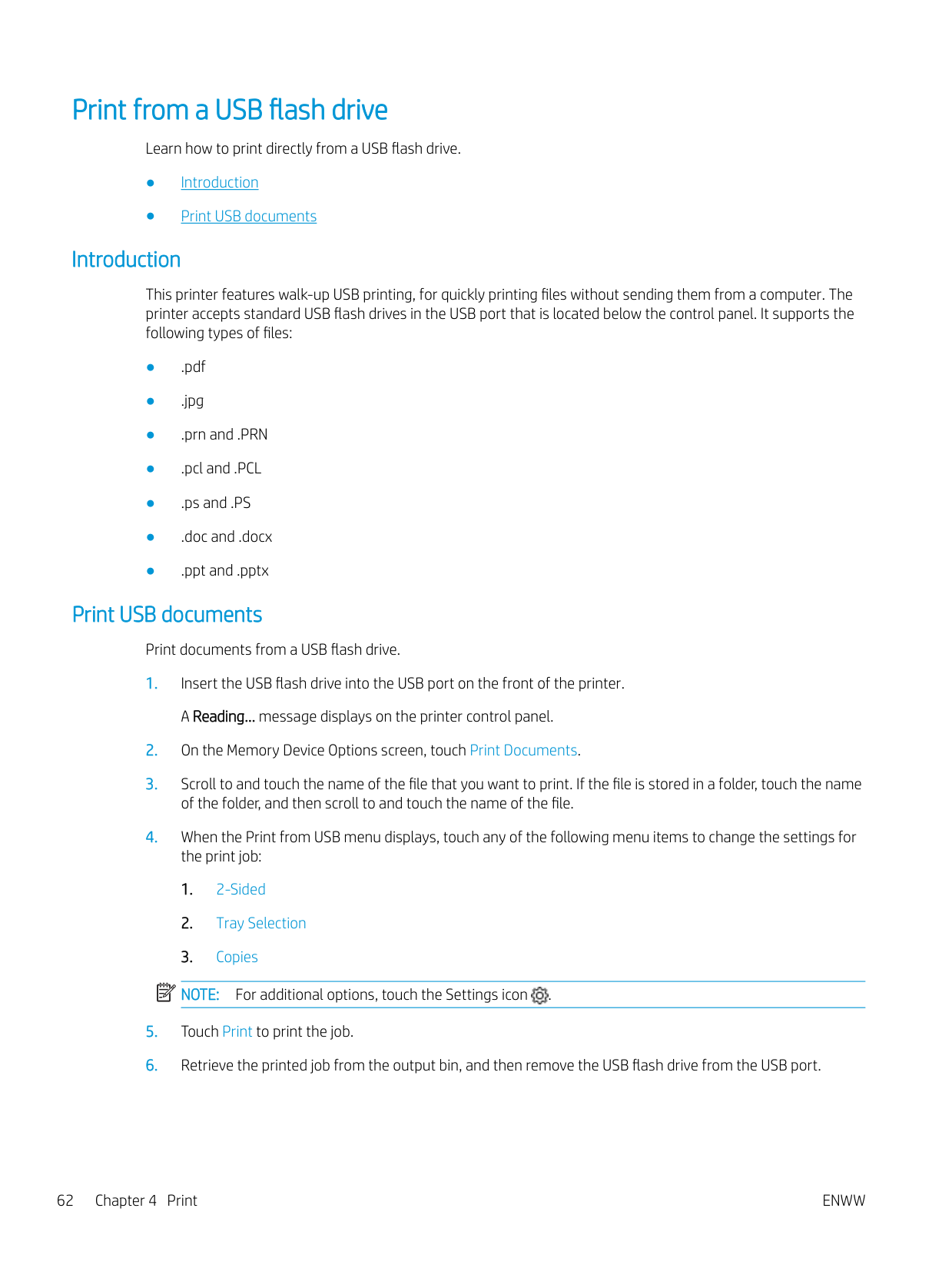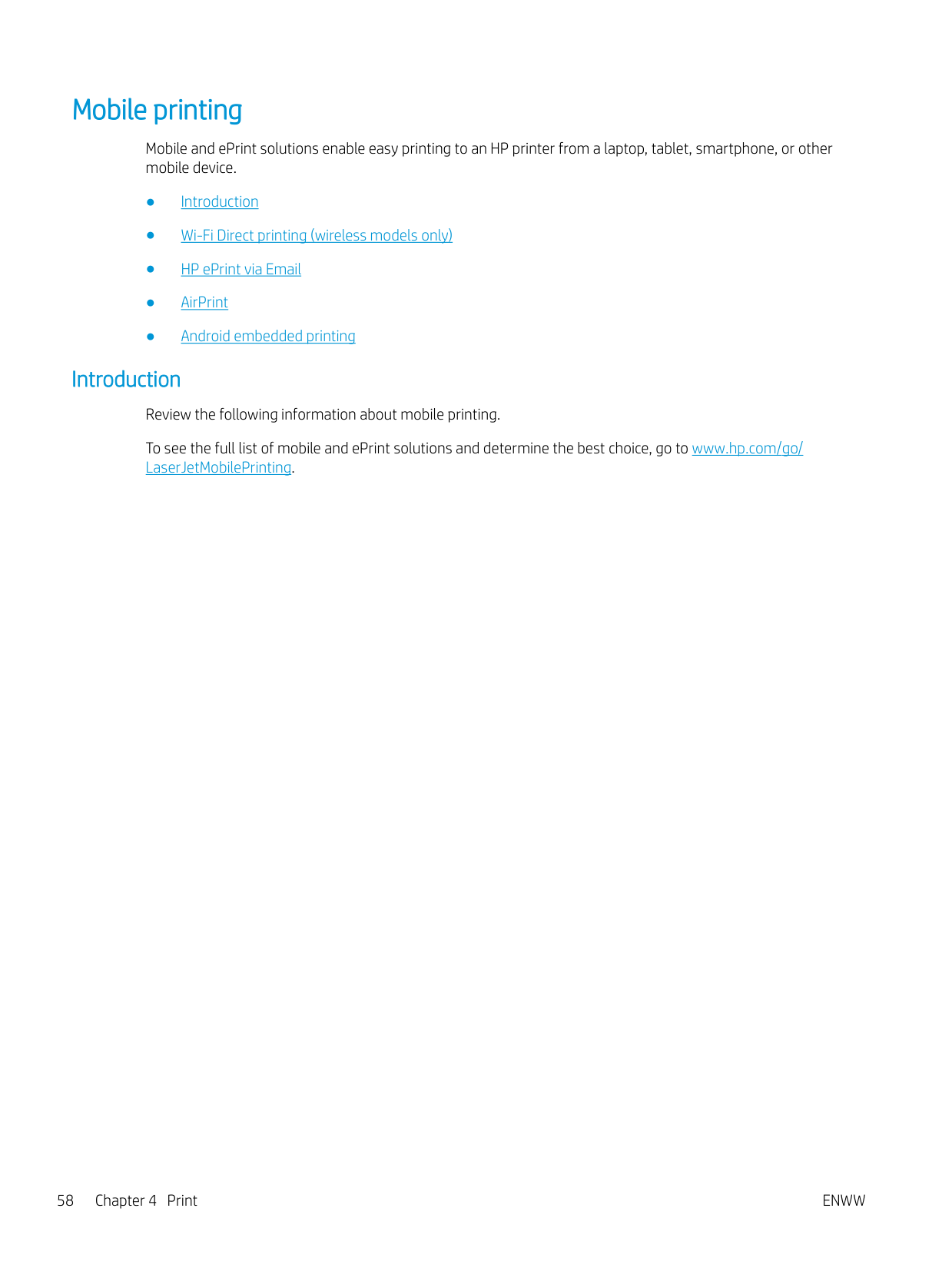 Additional print tasks ........................................................................................................................................ 51 Store print jobs on the printer to print later or print privately ........................................................................................ 52 Introduction ........................................................................................................................................................ 52 Before beginning ............................................................................................................................................... 52 Set up job storage ............................................................................................................................................. 52 Disable or enable the job storage feature ..................................................................................................... 53 Create a stored job (Windows) ......................................................................................................................... 54 Create a stored job (macOS) ............................................................................................................................ 54 Print a stored job ............................................................................................................................................... 55 Delete a stored job ............................................................................................................................................ 57 Delete a job that is stored on the printer .................................................................................. 57 Information sent to printer for Job Accounting purposes ........................................................................... 57 Mobile printing ........................................................................................................................................................................ 58 Introduction ........................................................................................................................................................ 58 Wi-Fi Direct printing (wireless models only) .................................................................................................. 59 To turn on Wi-Fi Direct .................................................................................................................. 59 Change the printer Wi-Fi Direct name ....................................................................................... 60 Step one: Open the HP Embedded Web Server ................................................... 60 Step two: Change the Wi-Fi Direct name .............................................................. 60 HP ePrint via Email ............................................................................................................................................ 60 AirPrint ................................................................................................................................................................. 61 Android embedded printing ............................................................................................................................. 61 Print from a USB flash drive ................................................................................................................................................. 62 Introduction ........................................................................................................................................................ 62 Print USB documents ........................................................................................................................................ 62 5 Copy .......................................................................................................................................................................................................... 63 Make a copy ............................................................................................................................................................................. 63 Copy on both sides (duplex) ................................................................................................................................................. 64 Copy on both sides automatically ................................................................................................................... 64 Copy on both sides manually ........................................................................................................................... 64 Copy an identification card .................................................................................................................................................... 64 Additional copy tasks ............................................................................................................................................................. 65 6 Scan .......................................................................................................................................................................................................... 67 Scan by using HP Scan software (Windows) ...................................................................................................................... 67 Scan by using HP Easy Scan Software (macOS) ................................................................................................................ 68 Set up Scan to Email .............................................................................................................................................................. 69 Introduction ........................................................................................................................................................ 69 Before you begin 