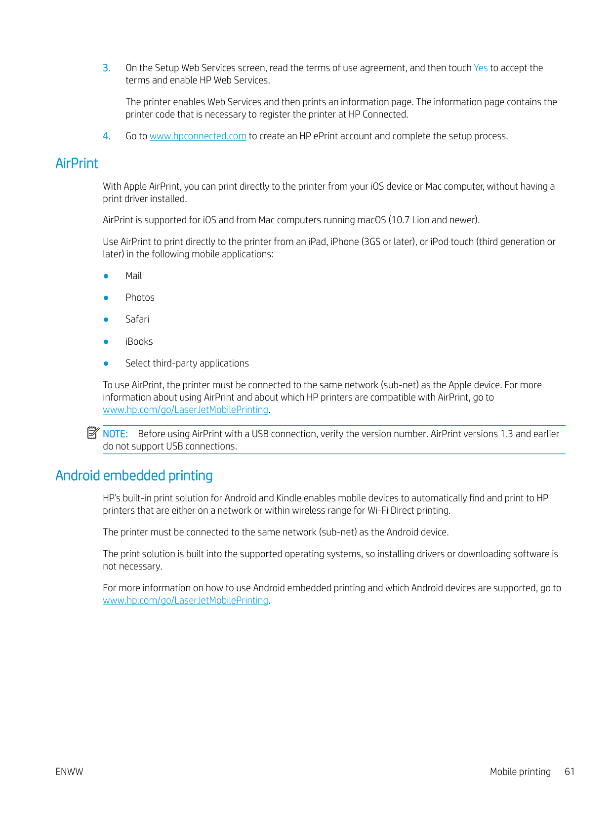 Mobile printing solutions HP offers multiple mobile and ePrint solutions to enable easy printing to an HP printer from a laptop, tablet, smartphone, or other mobile device. To see the full list and to determine the best choice, go to www.hp.com/go/MobilePrinting. The printer supports the following software for mobile printing: ● Wi-Fi Direct (wireless models only) ● Bluetooth Low Energy ● HP Smart app for iOS and Android devices ● Google Cloud Print ● AirPrint ● Android Printing ● HP Roam Printer dimensions Make sure your printer environment is large enough to accommodate the printer. 1 3 2 1