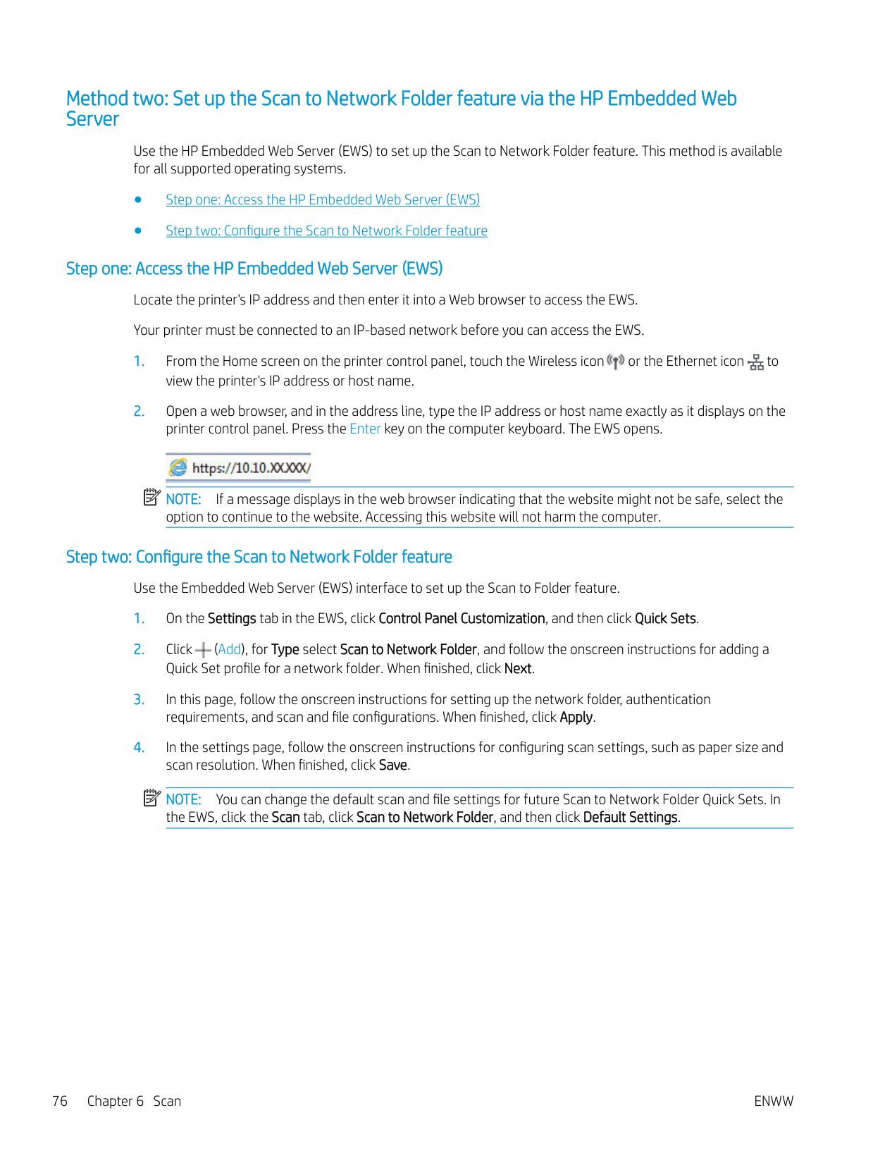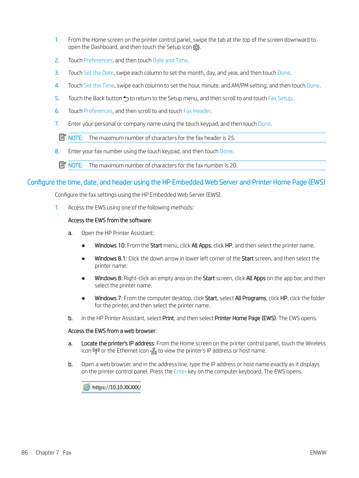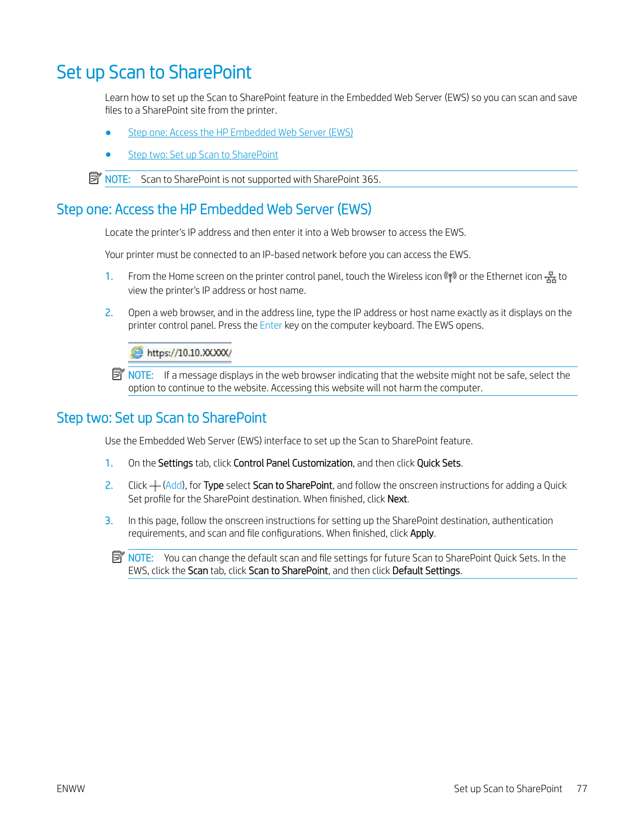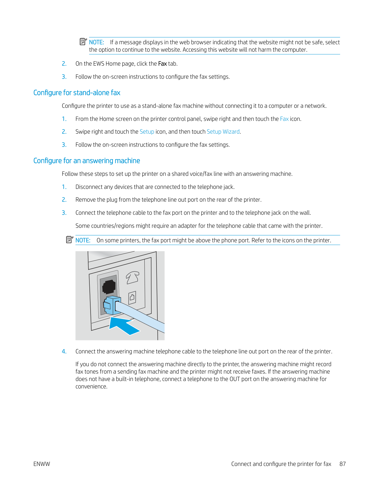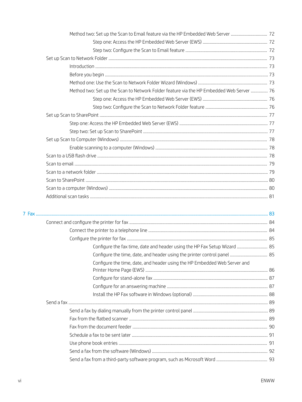 vMethod two: Set up the Scan to Email feature via the HP Embedded Web Server ................................ 72 Step one: Access the HP Embedded Web Server (EWS) ......................................................... 72 Step two: Configure the Scan to Email feature ........................................................................ 72 Set up Scan to Network Folder ............................................................................................................................................ 73 Introduction ........................................................................................................................................................ 73 Before you begin ................................................................................................................................................ 73 Method one: Use the Scan to Network Folder Wizard (Windows) ............................................................. 73 Method two: Set up the Scan to Network Folder feature via the HP Embedded Web Server ............... 76 Step one: Access the HP Embedded Web Server (EWS) ......................................................... 76 Step two: Configure the Scan to Network Folder feature ....................................................... 76 Set up Scan to SharePoint .................................................................................................................................................... 77 Step one: Access the HP Embedded Web Server (EWS) .............................................................................. 77 Step two: Set up Scan to SharePoint .............................................................................................................. 77 Set up Scan to Computer (Windows) .................................................................................................................................. 78 Enable scanning to a computer (Windows) ................................................................................................... 78 Scan to a USB flash drive ...................................................................................................................................................... 78 Scan to email .......................................................................................................................................................................... 79 Scan to a network folder ....................................................................................................................................................... 79 Scan to SharePoint ................................................................................................................................................................. 80 Scan to a computer (Windows) ............................................................................................................................................ 80 Additional scan tasks ............................................................................................................................................................. 81 7 Fax ............................................................................................................................................................................................................. 83 Connect and configure the printer for fax .......................................................................................................................... 84 Connect the printer to a telephone line ......................................................................................................... 84 Configure the printer for fax ............................................................................................................................ 85 Configure the fax time, date and header using the HP Fax Setup Wizard ........................... 85 Configure the time, date, and header using the printer control panel ................................. 85 Configure the time, date, and header using the HP Embedded Web Server and Printer Home Page (EWS) ............................................................................................................ 86 Configure for stand-alone fax ..................................................................................................... 87 Configure for an answering machine ......................................................................................... 87 Install the HP Fax software in Windows (optional) .................................................................. 88 Send a fax ................................................................................................................................................................................ 89 Send a fax by dialing manually from the printer control panel .................................................................. 89 Fax from the flatbed scanner .......................................................................................................................... 89 Fax from the document feeder ....................................................................................................................... 90 Schedule a fax to be sent later ........................................................................................................................ 91 Use phone book entries ................................................................................................................................... 91 Send a fax from the software (Windows) ...................................................................................................... 92 Send a fax from a third-party software program, such as Microsoft Word ............................................. 93 vi