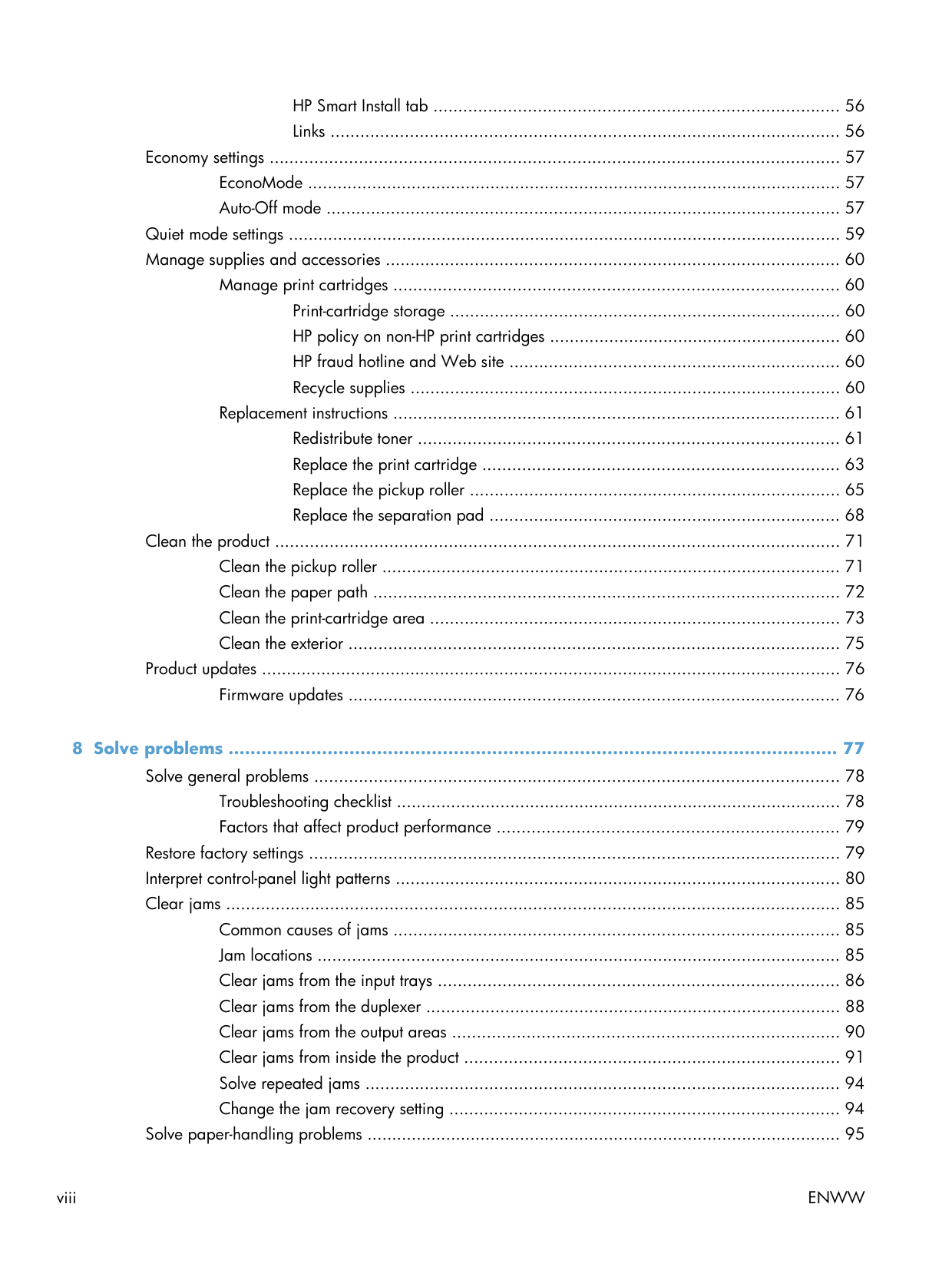 viiHP Smart Install tab .................................................................................. 56 Links ....................................................................................................... 56 Economy settings ................................................................................................................... 57 EconoMode ............................................................................................................ 57 Auto-Off mode ........................................................................................................ 57 Quiet mode settings ................................................................................................................ 59 Manage supplies and accessories ............................................................................................ 60 Manage print cartridges .......................................................................................... 60 Print-cartridge storage ............................................................................... 60 HP policy on non-HP print cartridges ........................................................... 60 HP fraud hotline and Web site ................................................................... 60 Recycle supplies ....................................................................................... 60 Replacement instructions .......................................................................................... 61 Redistribute toner ..................................................................................... 61 Replace the print cartridge ........................................................................ 63 Replace the pickup roller ........................................................................... 65 Replace the separation pad ....................................................................... 68 Clean the product .................................................................................................................. 71 Clean the pickup roller ............................................................................................. 71 Clean the paper path .............................................................................................. 72 Clean the print-cartridge area ................................................................................... 73 Clean the exterior ................................................................................................... 75 Product updates ..................................................................................................................... 76 Firmware updates ................................................................................................... 76 8 Solve problems ............................................................................................................... 77 Solve general problems .......................................................................................................... 78 Troubleshooting checklist .......................................................................................... 78 Factors that affect product performance ..................................................................... 79 Restore factory settings ........................................................................................................... 79 Interpret control-panel light patterns .......................................................................................... 80 Clear jams ............................................................................................................................ 85 Common causes of jams .......................................................................................... 85 Jam locations .......................................................................................................... 85 Clear jams from the input trays ................................................................................. 86 Clear jams from the duplexer .................................................................................... 88 Clear jams from the output areas .............................................................................. 90 Clear jams from inside the product ............................................................................ 91 Solve repeated jams ................................................................................................ 94 Change the jam recovery setting ............................................................................... 94 Solve paper-handling problems ................................................................................................ 95 viii