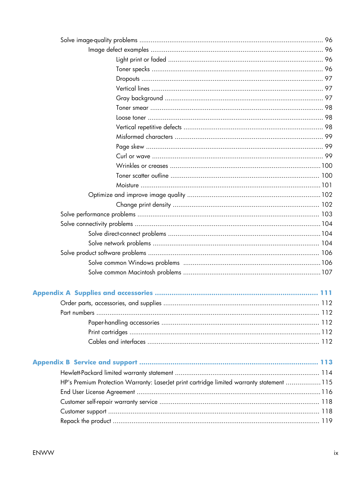 Solve image-quality problems .................................................................................................. 96 Image defect examples ............................................................................................ 96 Light print or faded ................................................................................... 96 Toner specks ............................................................................................ 96 Dropouts ................................................................................................. 97 Vertical lines ............................................................................................ 97 Gray background ..................................................................................... 97 Toner smear ............................................................................................ 98 Loose toner .............................................................................................. 98 Vertical repetitive defects .......................................................................... 98 Misformed characters ............................................................................... 99 Page skew ............................................................................................... 99 Curl or wave ........................................................................................... 99 Wrinkles or creases ................................................................................ 100 Toner scatter outline ............................................................................... 100 Moisture ................................................................................................ 101 Optimize and improve image quality ....................................................................... 102 Change print density .............................................................................. 102 Solve performance problems ................................................................................................. 103 Solve connectivity problems ................................................................................................... 104 Solve direct-connect problems ................................................................................. 104 Solve network problems ......................................................................................... 104 Solve product software problems ........................................................................................... 106 Solve common Windows problems ......................................................................... 106 Solve common Macintosh problems ......................................................................... 107 Appendix A Supplies and accessories .............................................................................. 111 Order parts, accessories, and supplies ................................................................................... 112 Part numbers ....................................................................................................................... 112 Paper-handling accessories .................................................................................... 112 Print cartridges ...................................................................................................... 112 Cables and interfaces ............................................................................................ 112 Appendix B Service and support ...................................................................................... 113 Hewlett-Packard limited warranty statement ............................................................................. 114 HP's Premium Protection Warranty: LaserJet print cartridge limited warranty statement .................. 115 End User License Agreement .................................................................................................. 116 Customer self-repair warranty service ..................................................................................... 118 Customer support ................................................................................................................. 118 Repack the product .............................................................................................................. 119