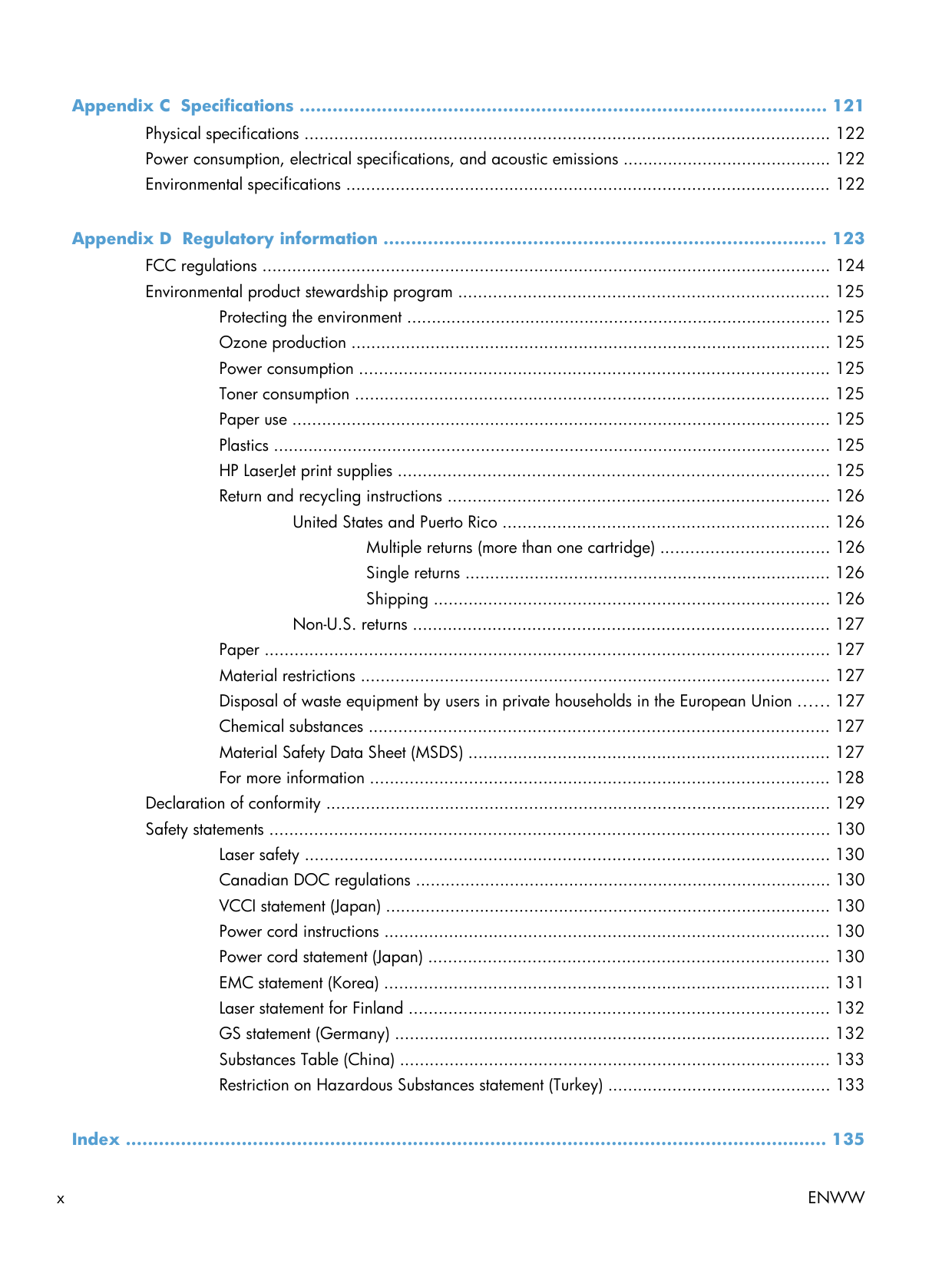 ixAppendix C Specifications ................................................................................................ 121 Physical specifications .......................................................................................................... 122 Power consumption, electrical specifications, and acoustic emissions .......................................... 122 Environmental specifications .................................................................................................. 122 Appendix D Regulatory information ................................................................................ 123 FCC regulations ................................................................................................................... 124 Environmental product stewardship program ........................................................................... 125 Protecting the environment ...................................................................................... 125 Ozone production ................................................................................................. 125 Power consumption ............................................................................................... 125 Toner consumption ................................................................................................ 125 Paper use ............................................................................................................. 125 Plastics ................................................................................................................. 125 HP LaserJet print supplies ....................................................................................... 125 Return and recycling instructions ............................................................................. 126 United States and Puerto Rico .................................................................. 126 Multiple returns (more than one cartridge) .................................. 126 Single returns .......................................................................... 126 Shipping ................................................................................ 126 Non-U.S. returns .................................................................................... 127 Paper .................................................................................................................. 127 Material restrictions ............................................................................................... 127 Disposal of waste equipment by users in private households in the European Union ...... 127 Chemical substances ............................................................................................. 127 Material Safety Data Sheet (MSDS) ......................................................................... 127 For more information ............................................................................................. 128 Declaration of conformity ...................................................................................................... 129 Safety statements ................................................................................................................. 130 Laser safety .......................................................................................................... 130 Canadian DOC regulations .................................................................................... 130 VCCI statement (Japan) .......................................................................................... 130 Power cord instructions .......................................................................................... 130 Power cord statement (Japan) ................................................................................. 130 EMC statement (Korea) .......................................................................................... 131 Laser statement for Finland ..................................................................................... 132 GS statement (Germany) ........................................................................................ 132 Substances Table (China) ....................................................................................... 133 Restriction on Hazardous Substances statement (Turkey) ............................................. 133 Index ............................................................................................................................... 135 x