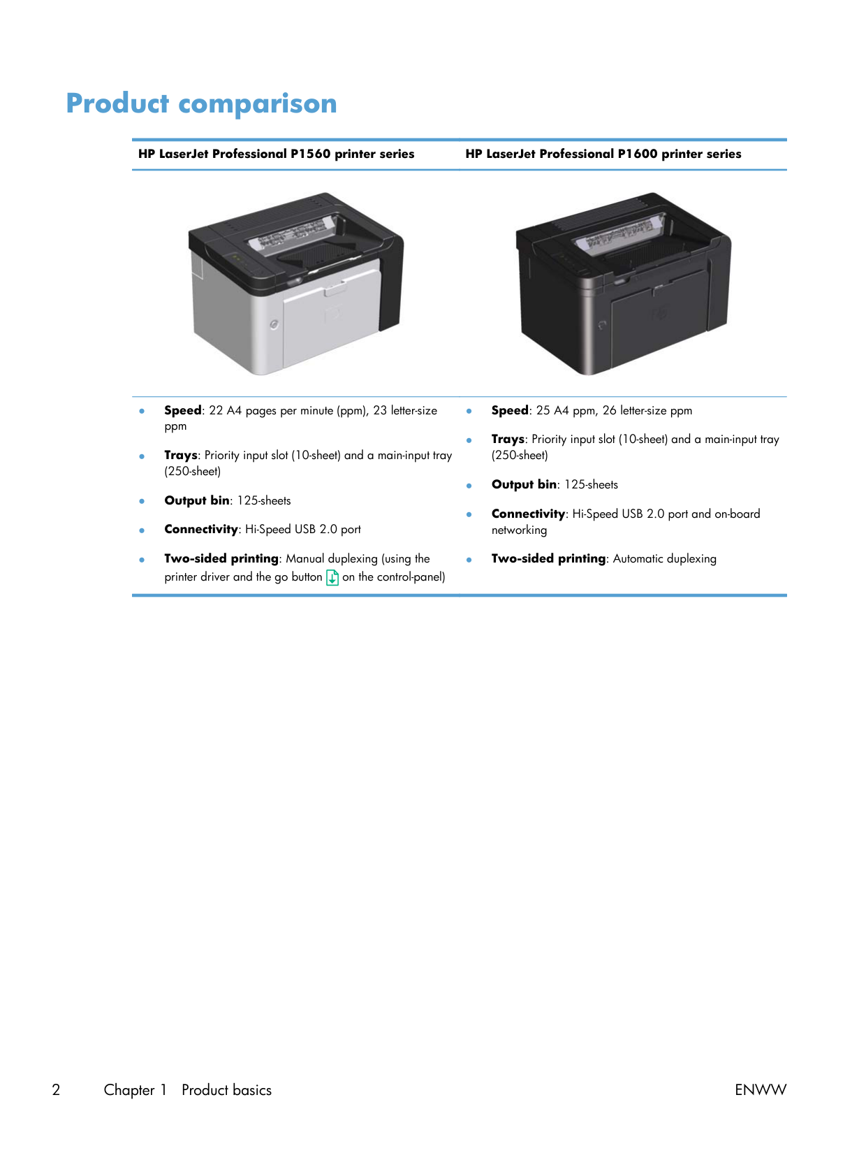 1Product comparison HP LaserJet Professional P1560 printer series HP LaserJet Professional P1600 printer series ● Speed: 22 A4 pages per minute (ppm), 23 letter-size ppm ● Trays: Priority input slot (10-sheet) and a main-input tray (250-sheet) ● Output bin: 125-sheets ● Connectivity: Hi-Speed USB 2.0 port ● Two-sided printing: Manual duplexing (using the printer driver and the go button on the control-panel) ● Speed: 25 A4 ppm, 26 letter-size ppm ● Trays: Priority input slot (10-sheet) and a main-input tray (250-sheet) ● Output bin: 125-sheets ● Connectivity: Hi-Speed USB 2.0 port and on-board networking ● Two-sided printing: Automatic duplexing 2 Chapter 1 Product basics