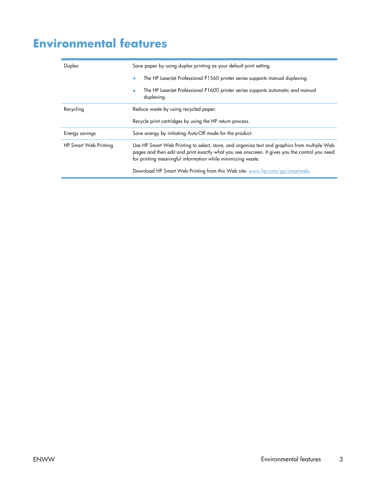 Environmental features Duplex Save paper by using duplex printing as your default print setting. ● The HP LaserJet Professional P1560 printer series supports manual duplexing. ● The HP LaserJet Professional P1600 printer series supports automatic and manual duplexing. Recycling Reduce waste by using recycled paper. Recycle print cartridges by using the HP return process. Energy savings Save energy by initiating Auto-Off mode for the product. HP Smart Web Printing Use HP Smart Web Printing to select, store, and organize text and graphics from multiple Web pages and then edit and print exactly what you see onscreen. It gives you the control you need for printing meaningful information while minimizing waste. Download HP Smart Web Printing from this Web site: www.hp.com/go/smartweb.