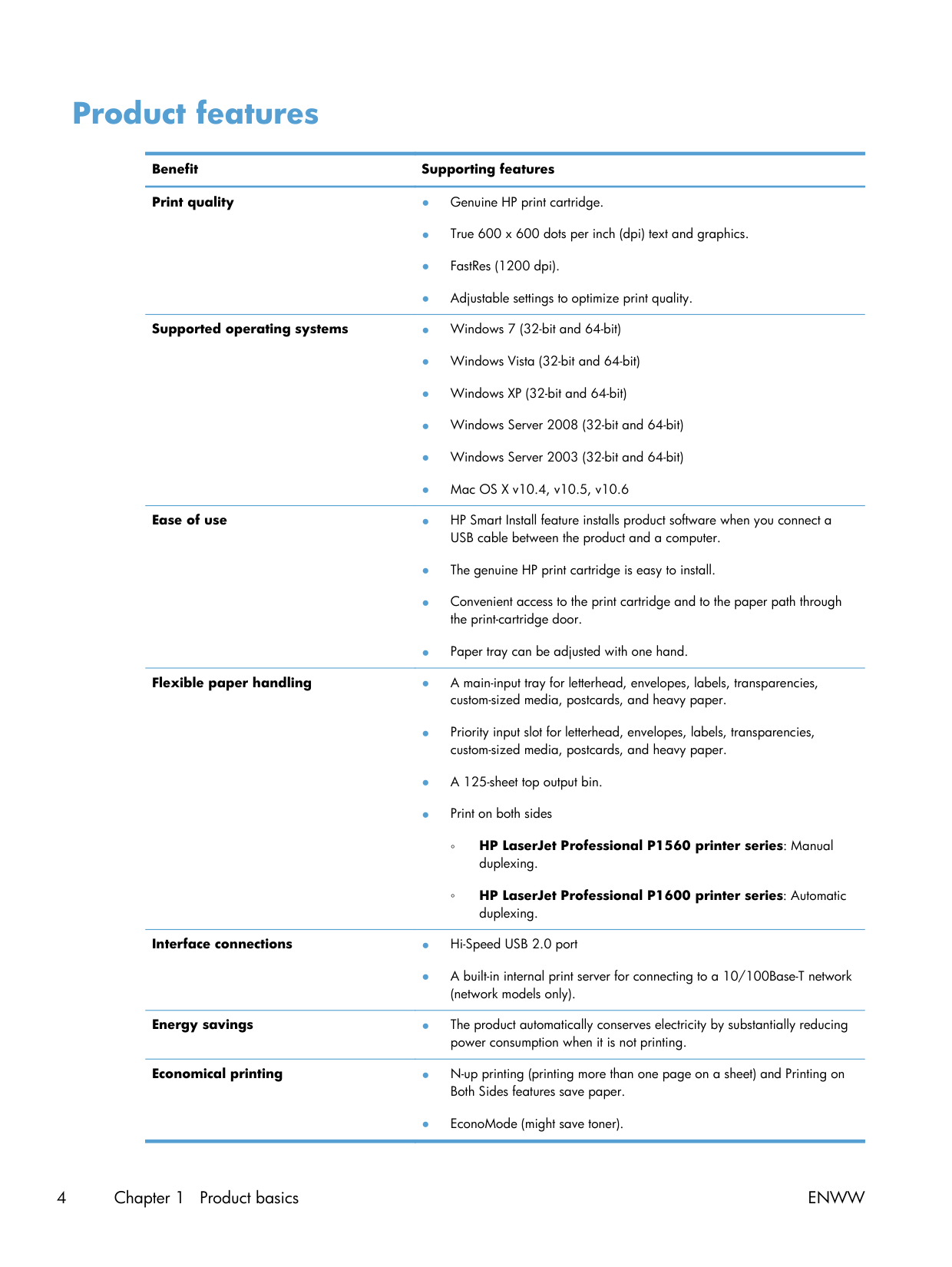 Environmental features 3Product features Benefit Supporting features Print quality ● Genuine HP print cartridge. ● True 600 x 600 dots per inch (dpi) text and graphics. ● FastRes (1200 dpi). ● Adjustable settings to optimize print quality. Supported operating systems ● Windows 7 (32-bit and 64-bit) ● Windows Vista (32-bit and 64-bit) ● Windows XP (32-bit and 64-bit) ● Windows Server 2008 (32-bit and 64-bit) ● Windows Server 2003 (32-bit and 64-bit) ● Mac OS X v10.4, v10.5, v10.6 Ease of use ● HP Smart Install feature installs product software when you connect a USB cable between the product and a computer. ● The genuine HP print cartridge is easy to install. ● Convenient access to the print cartridge and to the paper path through the print-cartridge door. ● Paper tray can be adjusted with one hand. Flexible paper handling ● A main-input tray for letterhead, envelopes, labels, transparencies, custom-sized media, postcards, and heavy paper. ● Priority input slot for letterhead, envelopes, labels, transparencies, custom-sized media, postcards, and heavy paper. ● A 125-sheet top output bin. ● Print on both sides ◦ HP LaserJet Professional P1560 printer series: Manual duplexing. ◦ HP LaserJet Professional P1600 printer series: Automatic duplexing. Interface connections ● Hi-Speed USB 2.0 port ● A built-in internal print server for connecting to a 10/100Base-T network (network models only). Energy savings ● The product automatically conserves electricity by substantially reducing power consumption when it is not printing. Economical printing ● N-up printing (printing more than one page on a sheet) and Printing on Both Sides features save paper. ● EconoMode (might save toner). 4 Chapter 1 Product basics