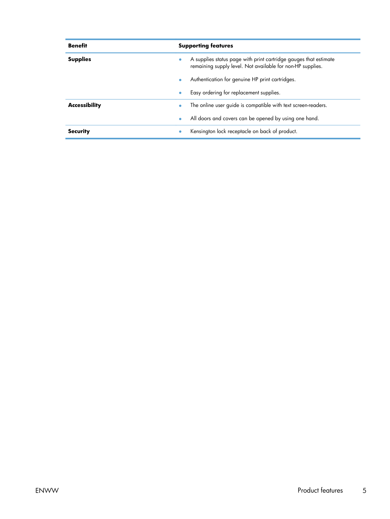 Benefit Supporting features Supplies ● A supplies status page with print cartridge gauges that estimate remaining supply level. Not available for non-HP supplies. ● Authentication for genuine HP print cartridges. ● Easy ordering for replacement supplies. Accessibility ● The online user guide is compatible with text screen-readers. ● All doors and covers can be opened by using one hand. Security ● Kensington lock receptacle on back of product.