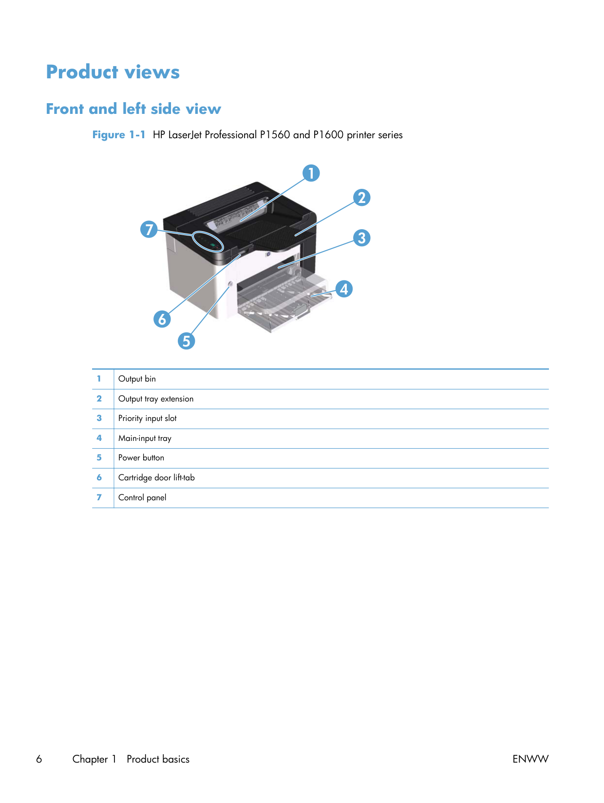 Product features 5Product views Front and left side view Figure 1-1 HP LaserJet Professional P1560 and P1600 printer series 4 2 5 6 3 1 7 1 Output bin 2 Output tray extension 3 Priority input slot 4 Main-input tray 5 Power button 6 Cartridge door lift-tab 7 Control panel 6 Chapter 1 Product basics