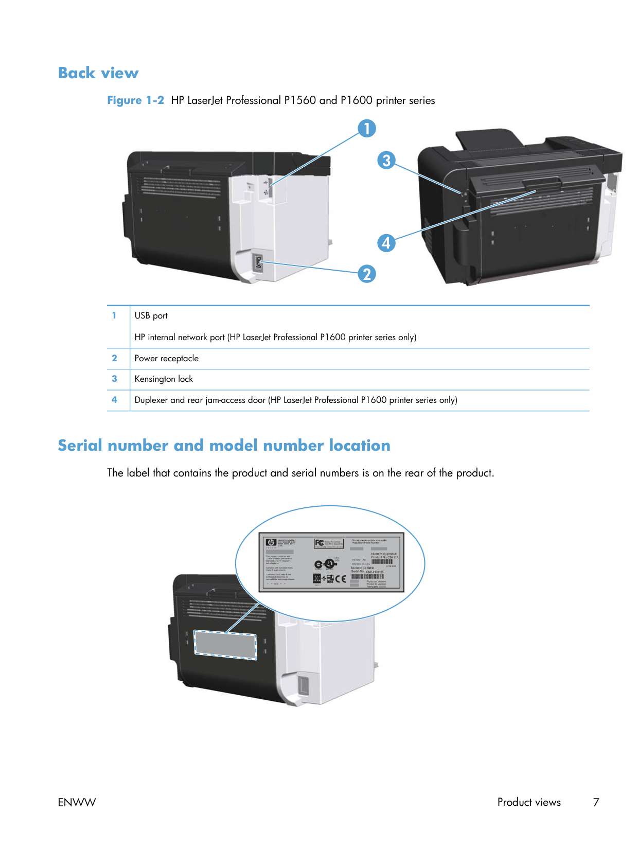 Back view Figure 1-2 HP LaserJet Professional P1560 and P1600 printer series 2 1 3 4 1 USB port HP internal network port (HP LaserJet Professional P1600 printer series only) 2 Power receptacle 3 Kensington lock 4 Duplexer and rear jam-access door (HP LaserJet Professional P1600 printer series only) Serial number and model number location The label that contains the product and serial numbers is on the rear of the product.