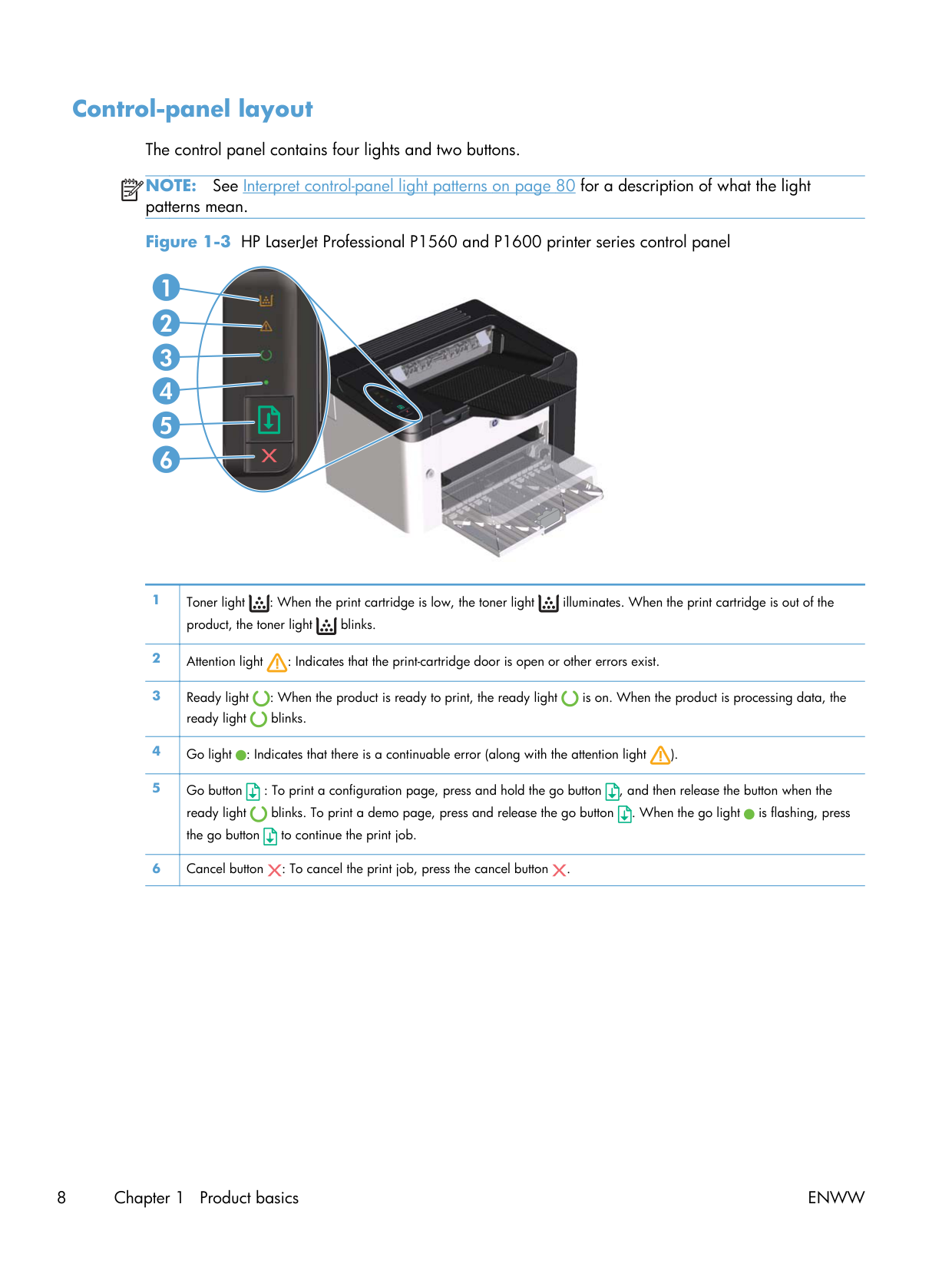 See Interpret control-panel light patterns on page 80 for a description of what the light patterns mean. Figure 1-3 HP LaserJet Professional P1560 and P1600 printer series control panel 2 3 4 5 6 1 1 Toner light : When the print cartridge is low, the toner light illuminates. When the print cartridge is out of the product, the toner light blinks. 2 Attention light : Indicates that the print-cartridge door is open or other errors exist. 3 Ready light : When the product is ready to print, the ready light is on. When the product is processing data, the ready light blinks. 4 Go light : Indicates that there is a continuable error (along with the attention light ). 5 Go button : To print a configuration page, press and hold the go button , and then release the button when the ready light blinks. To print a demo page, press and release the go button . When the go light is flashing, press the go button to continue the print job. 6 Cancel button : To cancel the print job, press the cancel button . 8 Chapter 1 Product basicsEnww