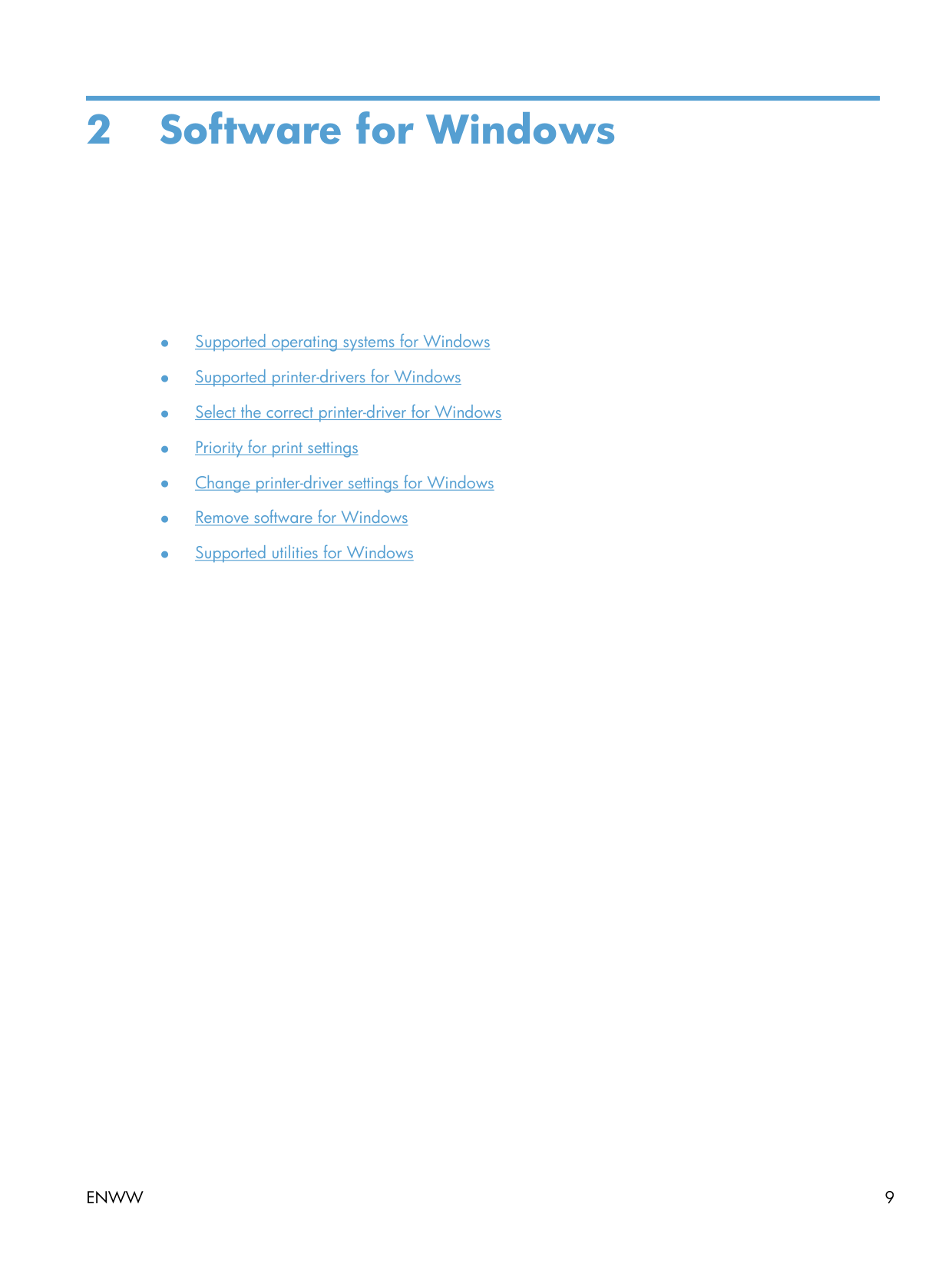 2 Software for Windows ● Supported operating systems for Windows ● Supported printer-drivers for Windows ● Select the correct printer-driver for Windows ● Priority for print settings ● Change printer-driver settings for Windows ● Remove software for Windows ● Supported utilities for Windows