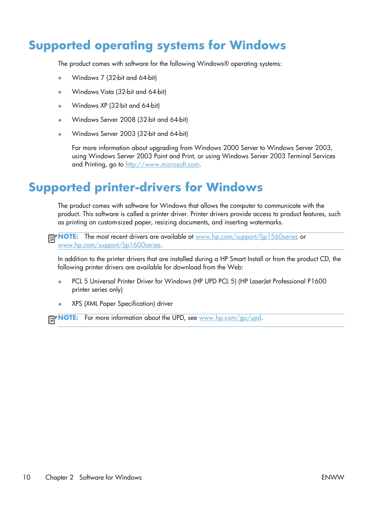 For more information about the UPD, see www.hp.com/go/upd. 10 Chapter 2 Software for WindowsEnww