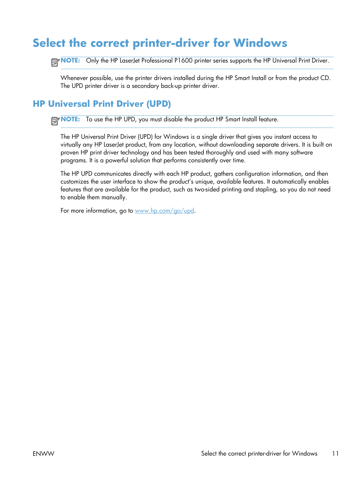 To use the HP UPD, you must disable the product HP Smart Install feature. The HP Universal Print Driver (UPD) for Windows is a single driver that gives you instant access to virtually any HP LaserJet product, from any location, without downloading separate drivers. It is built on proven HP print driver technology and has been tested thoroughly and used with many software programs. It is a powerful solution that performs consistently over time. The HP UPD communicates directly with each HP product, gathers configuration information, and then customizes the user interface to show the product’s unique, available features. It automatically enables features that are available for the product, such as two-sided printing and stapling, so you do not need to enable them manually. For more information, go to www.hp.com/go/upd.Enww