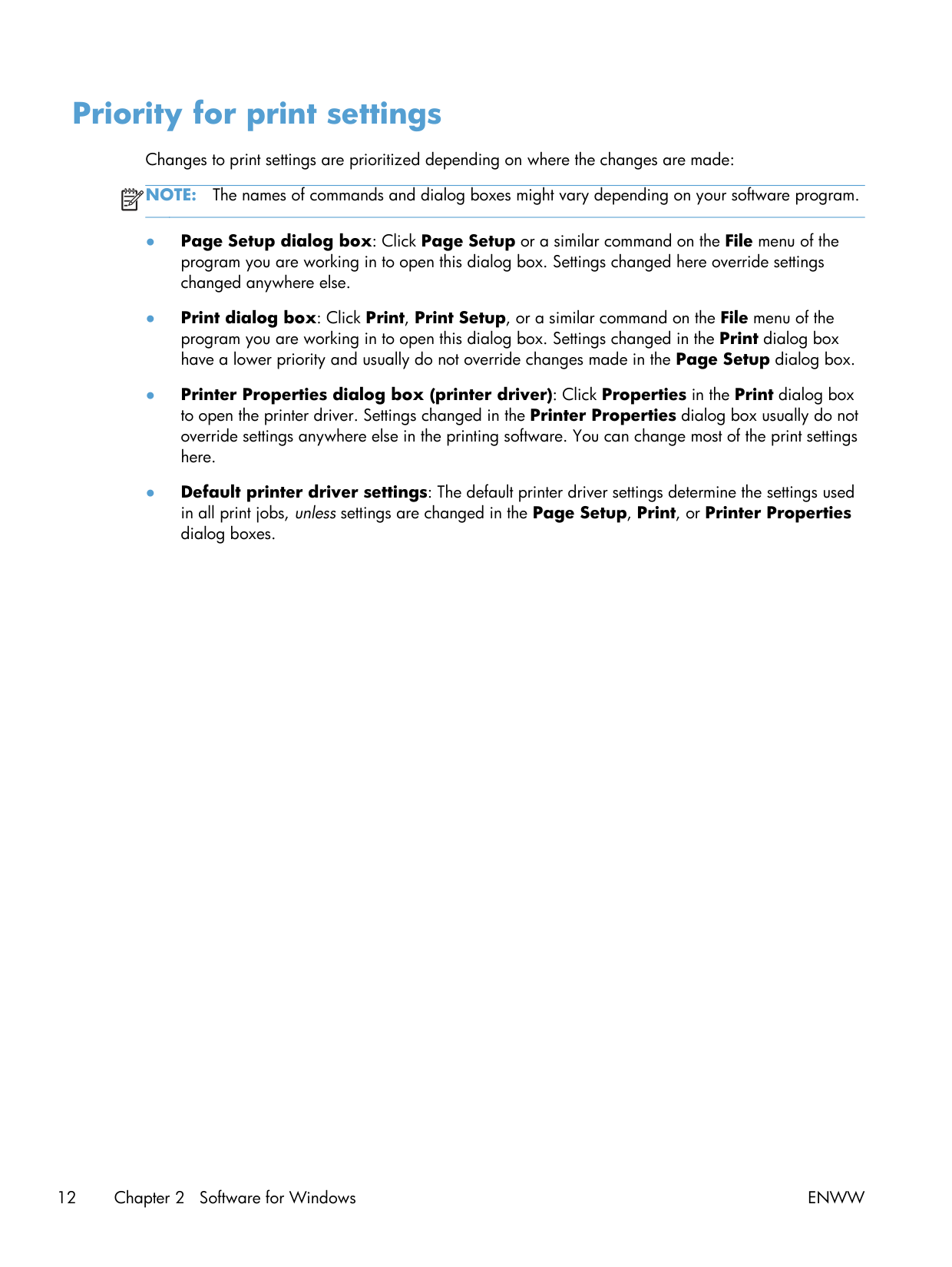 The names of commands and dialog boxes might vary depending on your software program. ● Page Setup dialog box: Click Page Setup or a similar command on the File menu of the program you are working in to open this dialog box. Settings changed here override settings changed anywhere else. ● Print dialog box: Click Print, Print Setup, or a similar command on the File menu of the program you are working in to open this dialog box. Settings changed in the Print dialog box have a lower priority and usually do not override changes made in the Page Setup dialog box. ● Printer Properties dialog box (printer driver): Click Properties in the Print dialog box to open the printer driver. Settings changed in the Printer Properties dialog box usually do not override settings anywhere else in the printing software. You can change most of the print settings here. ● Default printer driver settings: The default printer driver settings determine the settings used in all print jobs, unless settings are changed in the Page Setup, Print, or Printer Properties dialog boxes. 12 Chapter 2 Software for WindowsEnww