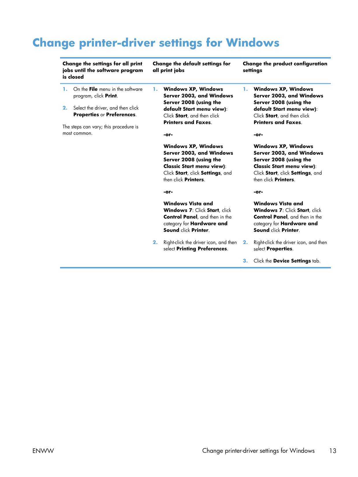 Change printer-driver settings for Windows Change the settings for all print jobs until the software program is closed Change the default settings for all print jobs Change the product configuration settings
