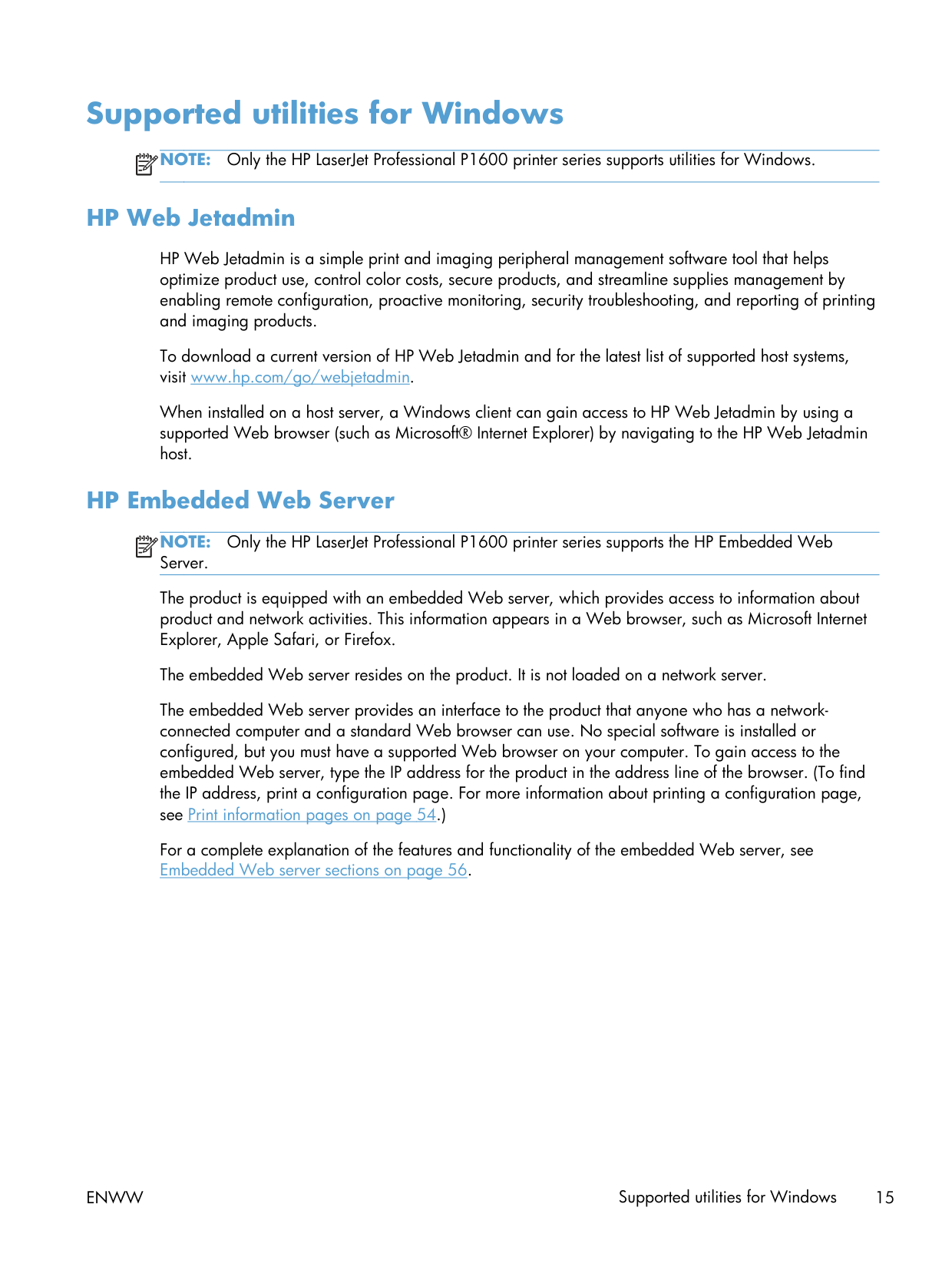 Only the HP LaserJet Professional P1600 printer series supports utilities for Windows. HP Web Jetadmin HP Web Jetadmin is a simple print and imaging peripheral management software tool that helps optimize product use, control color costs, secure products, and streamline supplies management by enabling remote configuration, proactive monitoring, security troubleshooting, and reporting of printing and imaging products. To download a current version of HP Web Jetadmin and for the latest list of supported host systems, visit www.hp.com/go/webjetadmin. When installed on a host server, a Windows client can gain access to HP Web Jetadmin by using a supported Web browser (such as Microsoft® Internet Explorer) by navigating to the HP Web Jetadmin host. HP Embedded Web ServerNote: