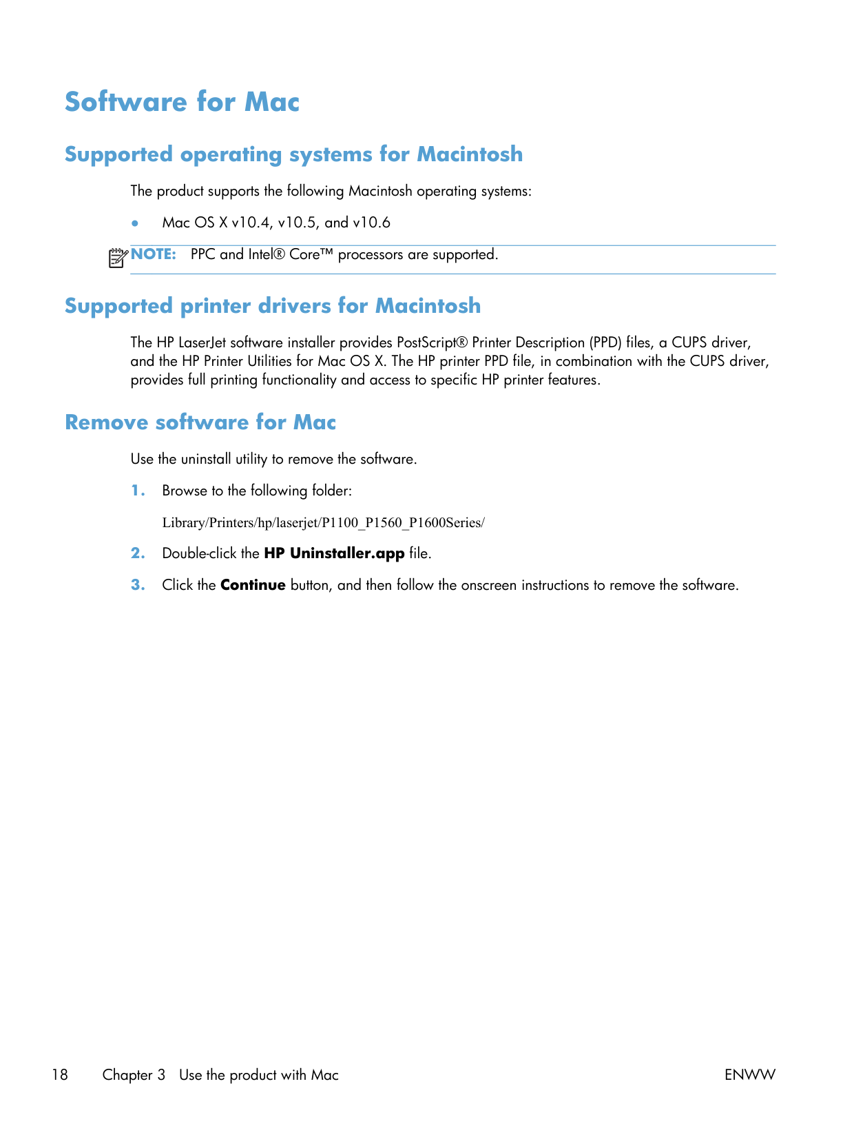 PPC and Intel® Core™ processors are supported. Supported printer drivers for Macintosh The HP LaserJet software installer provides PostScript® Printer Description (PPD) files, a CUPS driver, and the HP Printer Utilities for Mac OS X. The HP printer PPD file, in combination with the CUPS driver, provides full printing functionality and access to specific HP printer features. Remove software for Mac Use the uninstall utility to remove the software.Enww