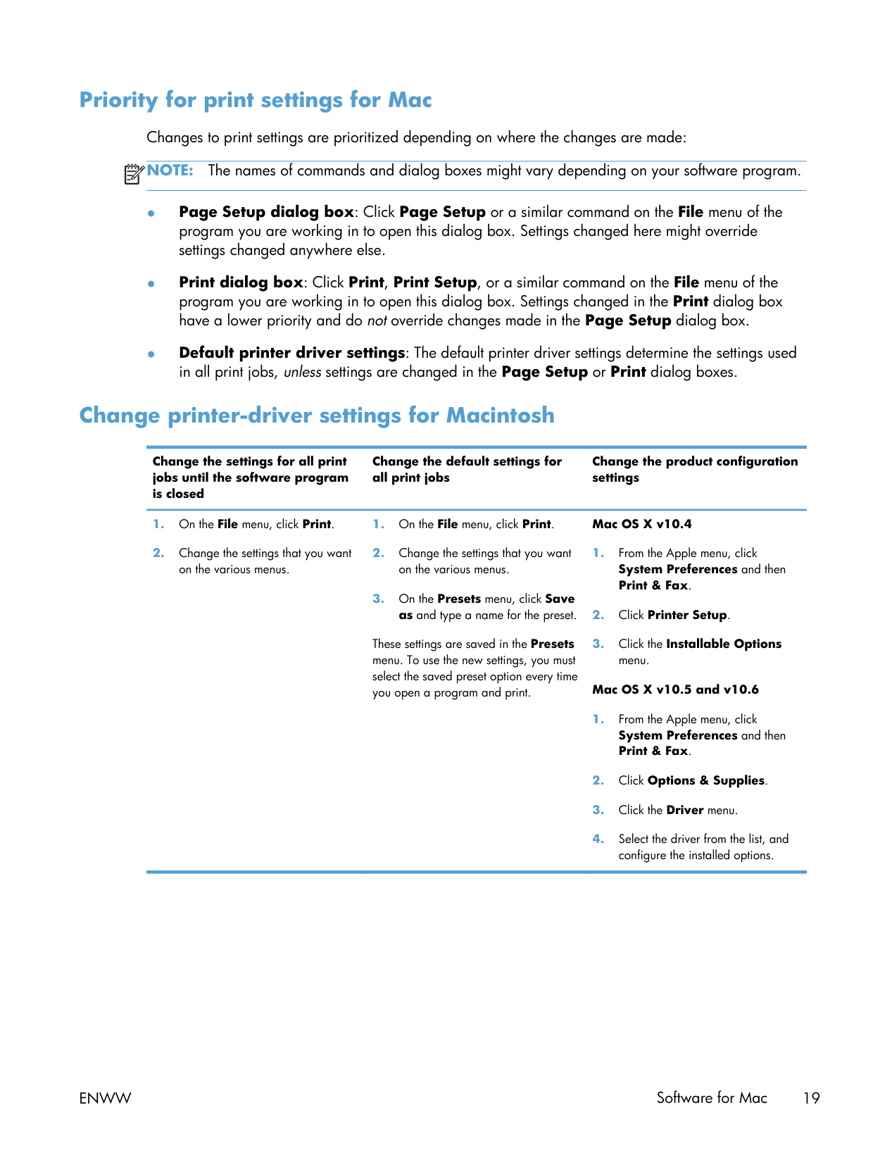 The names of commands and dialog boxes might vary depending on your software program. ● Page Setup dialog box: Click Page Setup or a similar command on the File menu of the program you are working in to open this dialog box. Settings changed here might override settings changed anywhere else. ● Print dialog box: Click Print, Print Setup, or a similar command on the File menu of the program you are working in to open this dialog box. Settings changed in the Print dialog box have a lower priority and do not override changes made in the Page Setup dialog box. ● Default printer driver settings: The default printer driver settings determine the settings used in all print jobs, unless settings are changed in the Page Setup or Print dialog boxes. Change printer-driver settings for Macintosh Change the settings for all print jobs until the software program is closed Change the default settings for all print jobs Change the product configuration settingsEnww