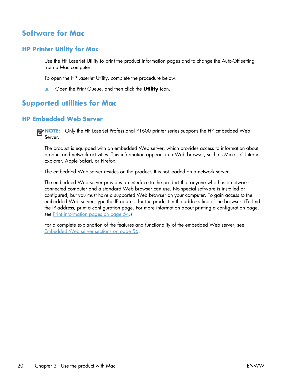 Only the HP LaserJet Professional P1600 printer series supports the HP Embedded Web Server. The product is equipped with an embedded Web server, which provides access to information about product and network activities. This information appears in a Web browser, such as Microsoft Internet Explorer, Apple Safari, or Firefox. The embedded Web server resides on the product. It is not loaded on a network server. The embedded Web server provides an interface to the product that anyone who has a network- connected computer and a standard Web browser can use. No special software is installed or configured, but you must have a supported Web browser on your computer. To gain access to the embedded Web server, type the IP address for the product in the address line of the browser. (To find the IP address, print a configuration page. For more information about printing a configuration page, see Print information pages on page 54.) For a complete explanation of the features and functionality of the embedded Web server, see Embedded Web server sections on page 56. 20 Chapter 3 Use the product with MacEnww