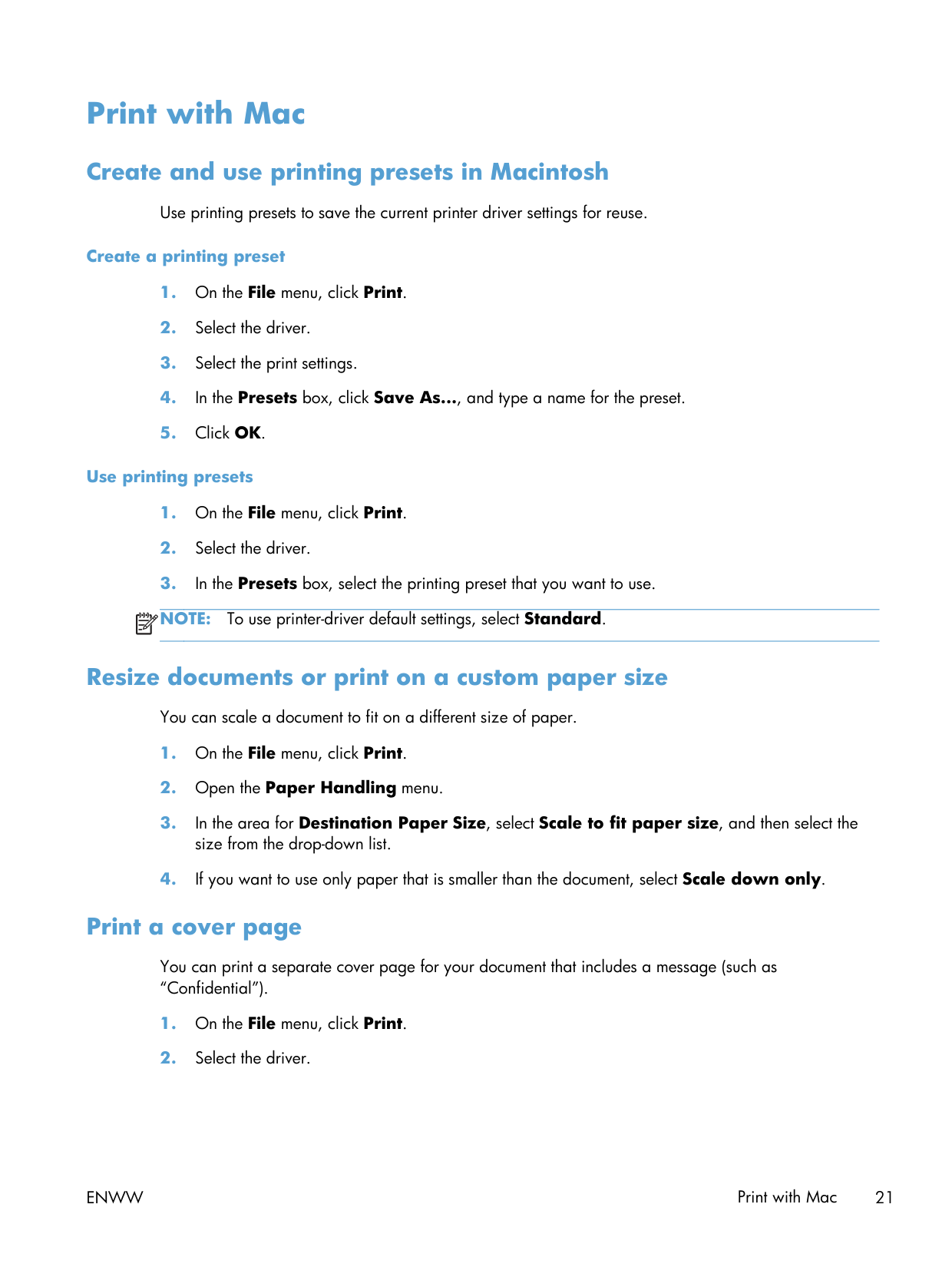 To use printer-driver default settings, select Standard. Resize documents or print on a custom paper size You can scale a document to fit on a different size of paper.Enww
