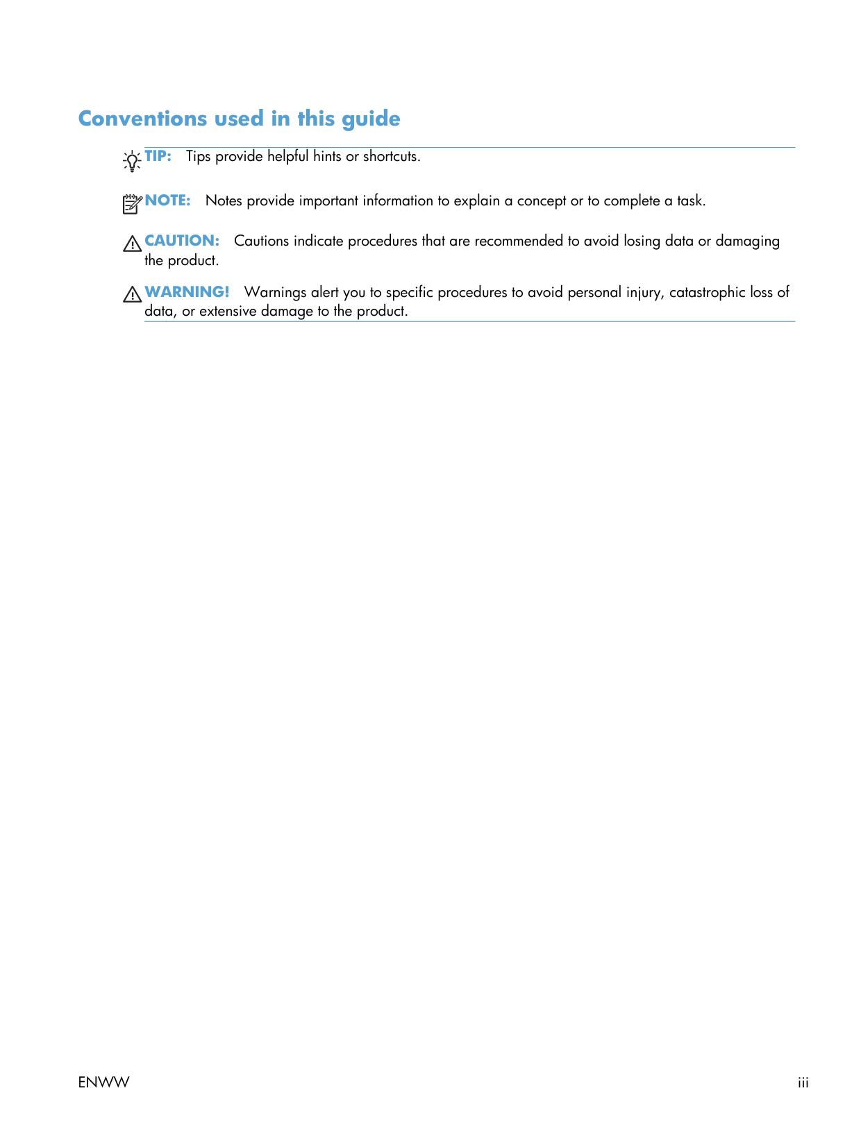Warnings alert you to specific procedures to avoid personal injury, catastrophic loss of data, or extensive damage to the product.Enww