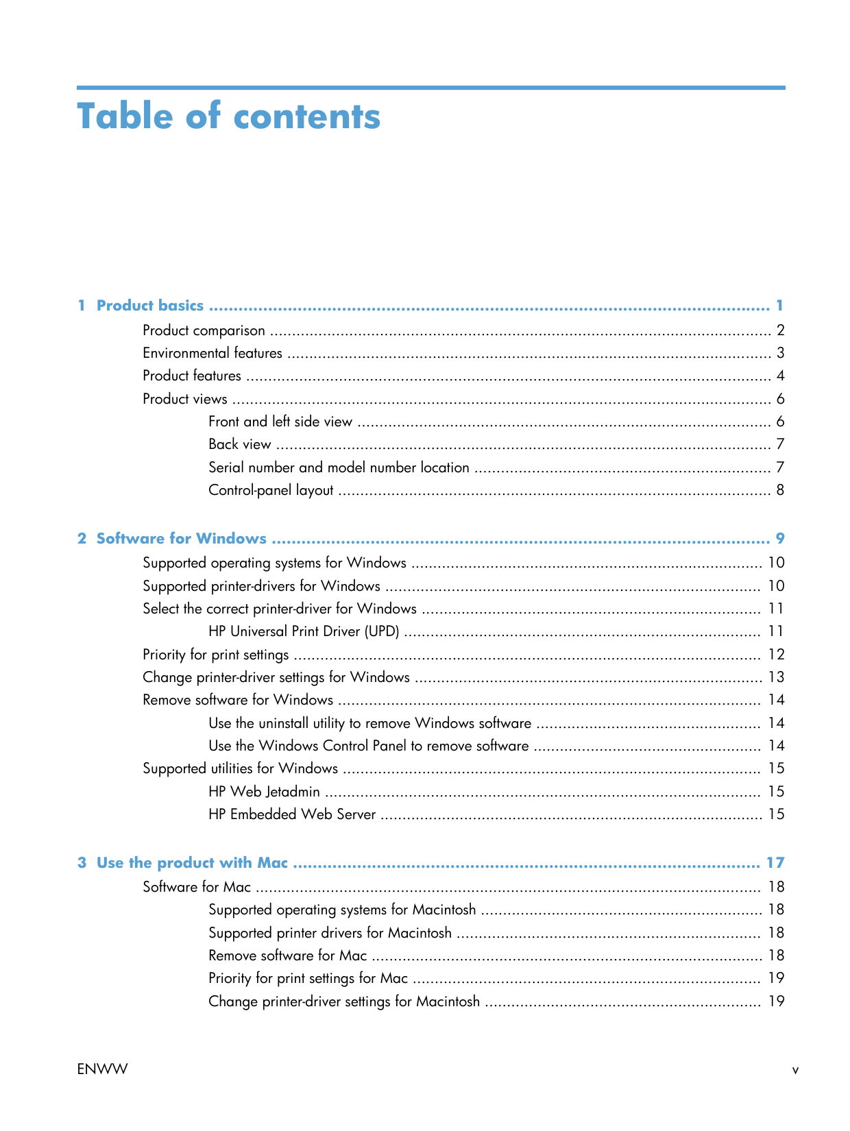 iiiTable of contents 1 Product basics .................................................................................................................. 1 Product comparison .................................................................................................................. 2 Environmental features .............................................................................................................. 3 Product features ....................................................................................................................... 4 Product views .......................................................................................................................... 6 Front and left side view .............................................................................................. 6 Back view ................................................................................................................ 7 Serial number and model number location ................................................................... 7 Control-panel layout .................................................................................................. 8 2 Software for Windows ..................................................................................................... 9 Supported operating systems for Windows ................................................................................ 10 Supported printer-drivers for Windows ..................................................................................... 10 Select the correct printer-driver for Windows ............................................................................. 11 HP Universal Print Driver (UPD) ................................................................................. 11 Priority for print settings .......................................................................................................... 12 Change printer-driver settings for Windows ............................................................................... 13 Remove software for Windows ................................................................................................ 14 Use the uninstall utility to remove Windows software ................................................... 14 Use the Windows Control Panel to remove software .................................................... 14 Supported utilities for Windows ............................................................................................... 15 HP Web Jetadmin ................................................................................................... 15 HP Embedded Web Server ....................................................................................... 15 3 Use the product with Mac ............................................................................................... 17 Software for Mac ................................................................................................................... 18 Supported operating systems for Macintosh ................................................................ 18 Supported printer drivers for Macintosh ..................................................................... 18 Remove software for Mac ......................................................................................... 18 Priority for print settings for Mac ............................................................................... 19 Change printer-driver settings for Macintosh ............................................................... 19