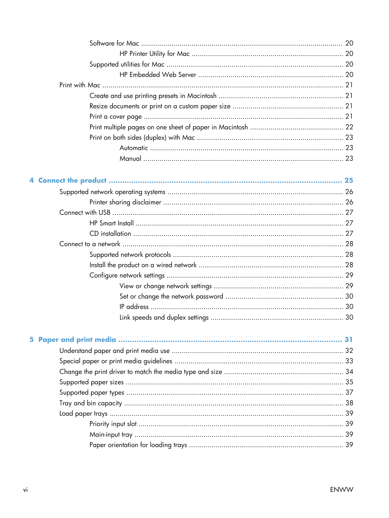 vSoftware for Mac .................................................................................................... 20 HP Printer Utility for Mac ........................................................................... 20 Supported utilities for Mac ....................................................................................... 20 HP Embedded Web Server ........................................................................ 20 Print with Mac ....................................................................................................................... 21 Create and use printing presets in Macintosh ............................................................. 21 Resize documents or print on a custom paper size ....................................................... 21 Print a cover page ................................................................................................... 21 Print multiple pages on one sheet of paper in Macintosh .............................................. 22 Print on both sides (duplex) with Mac ........................................................................ 23 Automatic ................................................................................................ 23 Manual ................................................................................................... 23 4 Connect the product ........................................................................................................ 25 Supported network operating systems ....................................................................................... 26 Printer sharing disclaimer ......................................................................................... 26 Connect with USB .................................................................................................................. 27 HP Smart Install ....................................................................................................... 27 CD installation ........................................................................................................ 27 Connect to a network ............................................................................................................. 28 Supported network protocols .................................................................................... 28 Install the product on a wired network ....................................................................... 28 Configure network settings ....................................................................................... 29 View or change network settings ................................................................ 29 Set or change the network password .......................................................... 30 IP address ............................................................................................... 30 Link speeds and duplex settings ................................................................. 30 5 Paper and print media ................................................................................................... 31 Understand paper and print media use ..................................................................................... 32 Special paper or print media guidelines ................................................................................... 33 Change the print driver to match the media type and size ........................................................... 34 Supported paper sizes ............................................................................................................ 35 Supported paper types ........................................................................................................... 37 Tray and bin capacity ............................................................................................................. 38 Load paper trays .................................................................................................................... 39 Priority input slot ..................................................................................................... 39 Main-input tray ....................................................................................................... 39 Paper orientation for loading trays ............................................................................ 39 vi