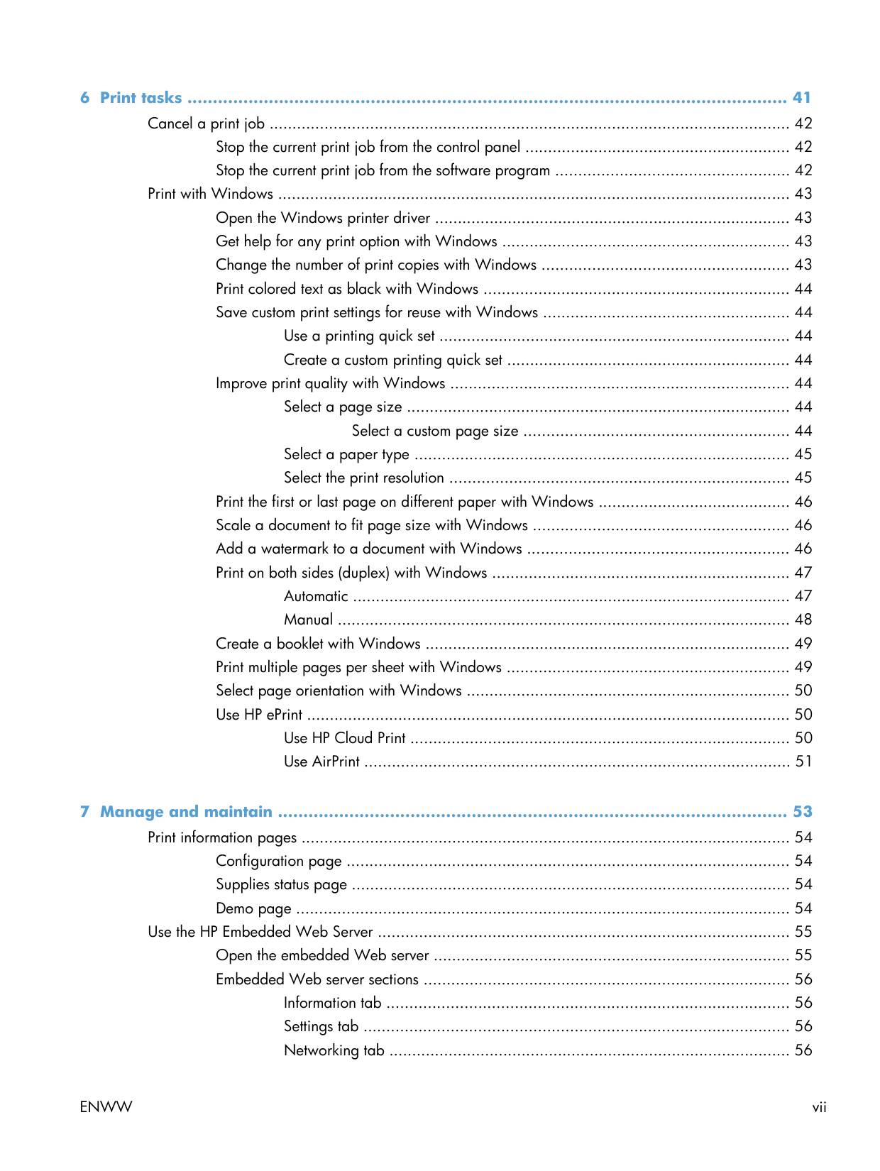 6 Print tasks ...................................................................................................................... 41 Cancel a print job .................................................................................................................. 42 Stop the current print job from the control panel .......................................................... 42 Stop the current print job from the software program ................................................... 42 Print with Windows ................................................................................................................ 43 Open the Windows printer driver .............................................................................. 43 Get help for any print option with Windows ............................................................... 43 Change the number of print copies with Windows ...................................................... 43 Print colored text as black with Windows ................................................................... 44 Save custom print settings for reuse with Windows ...................................................... 44 Use a printing quick set ............................................................................. 44 Create a custom printing quick set .............................................................. 44 Improve print quality with Windows .......................................................................... 44 Select a page size .................................................................................... 44 Select a custom page size .......................................................... 44 Select a paper type .................................................................................. 45 Select the print resolution .......................................................................... 45 Print the first or last page on different paper with Windows .......................................... 46 Scale a document to fit page size with Windows ........................................................ 46 Add a watermark to a document with Windows ......................................................... 46 Print on both sides (duplex) with Windows ................................................................. 47 Automatic ................................................................................................ 47 Manual ................................................................................................... 48 Create a booklet with Windows ................................................................................ 49 Print multiple pages per sheet with Windows .............................................................. 49 Select page orientation with Windows ....................................................................... 50 Use HP ePrint .......................................................................................................... 50 Use HP Cloud Print ................................................................................... 50 Use AirPrint ............................................................................................. 51 7 Manage and maintain .................................................................................................... 53 Print information pages ........................................................................................................... 54 Configuration page ................................................................................................. 54 Supplies status page ................................................................................................ 54 Demo page ............................................................................................................ 54 Use the HP Embedded Web Server .......................................................................................... 55 Open the embedded Web server .............................................................................. 55 Embedded Web server sections ................................................................................ 56 Information tab ........................................................................................ 56 Settings tab ............................................................................................. 56 Networking tab ........................................................................................ 56
