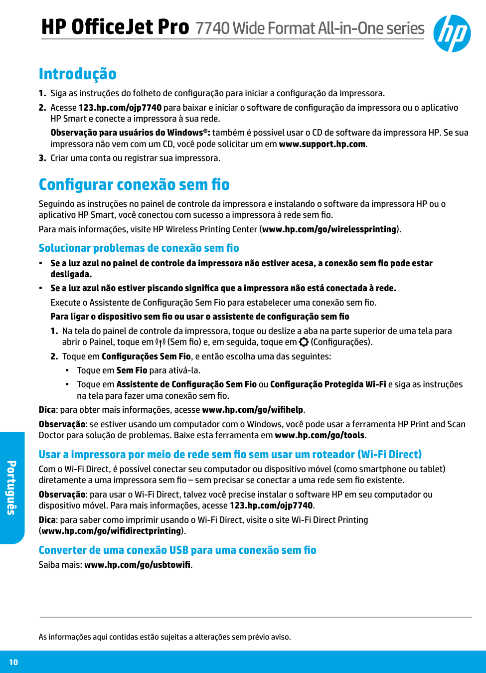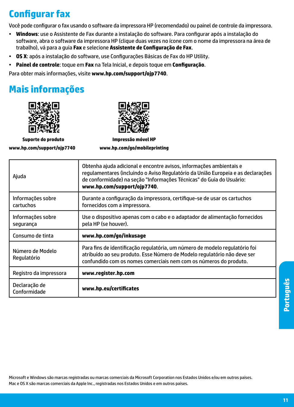 11 Microsoft e Windows são marcas registradas ou marcas comerciais da Microsoft Corporation nos Estados Unidos e/ou em outros países. Mac e OS X são marcas comerciais da Apple Inc., registradas nos Estados Unidos e em outros países. Configurar fax Você pode configurar o fax usando o software da impressora HP (recomendado) ou painel de controle da impressora. •• Windows: use o Assistente de Fax durante a instalação do software. Para configurar após a instalação do software, abra o software da impressora HP (clique duas vezes no ícone com o nome da impressora na área de trabalho), vá para a guia Fax e selecione Assistente de Configuração de Fax. •• OS X: após a instalação do software, use Configurações Básicas de Fax do HP Utility. •• Painel de controle: toque em Fax na Tela Inicial, e depois toque em Configuração. Para obter mais informações, visite www.hp.com/support/ojp7740. Mais informações Ajuda Obtenha ajuda adicional e encontre avisos, informações ambientais e regulamentares (incluindo o Aviso Regulatório da União Europeia e as declarações de conformidade) na seção "Informações Técnicas" do Guia do Usuário: www.hp.com/support/ojp7740. Informações sobre cartuchos Durante a configuração da impressora, certifique-se de usar os cartuchos fornecidos com a impressora. Informações sobre segurança Use o dispositivo apenas com o cabo e o adaptador de alimentação fornecidos pela HP (se houver). Consumo de tinta www.hp.com/go/inkusage Número de Modelo Regulatório Para fins de identificação regulatória, um número de modelo regulatório foi atribuído ao seu produto. Esse Número de Modelo regulatório não deve ser confundido com os nomes comerciais nem com os números do produto. Registro da impressora www.register.hp.com Declaração de Conformidade www.hp.eu/certificates Impressão móvel HP www.hp.com/go/mobileprinting Suporte do produto www.hp.com/support/ojp7740 Português