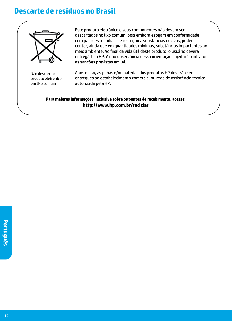 12 Descarte de resíduos no Brasil Não descarte o produto eletronico em lixo comum Para maiores informações, inclusive sobre os pontos de recebimento, acesse: http://www.hp.com.br/reciclar Este produto eletrônico e seus componentes não devem ser descartados no lixo comum, pois embora estejam em conformidade com padrões mundiais de restrição a substâncias nocivas, podem conter, ainda que em quantidades mínimas, substâncias impactantes ao meio ambiente. Ao final da vida útil deste produto, o usuário deverá entregá-lo à HP. A não observância dessa orientação sujeitará o infrator às sanções previstas em lei. Após o uso, as pilhas e/ou baterias dos produtos HP deverão ser entregues ao estabelecimento comercial ou rede de assistência técnica autorizada pela HP. Português