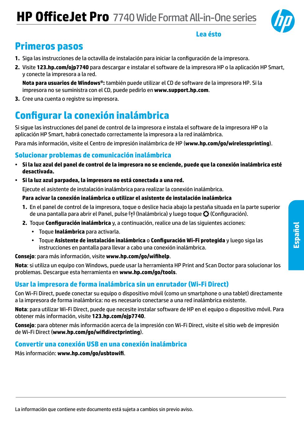8 Microsoft y Windows son marcas comerciales registradas o marcas comerciales de Microsoft Corporation en EE. UU. y otros países. Mac y OS X son marcas comerciales de Apple Inc., registradas en EE. UU. y otros países. Configuración del fax Puede configurar el fax usando el software de la impresora HP (recomendado) o en el panel de control de la impresora. •• Windows: utilice el asistente para el fax durante la instalación del software. Para configurarlo después de la instalación del software, abra el software de la impresora HP (haga doble clic en el icono con el nombre de la impresora en el escritorio), vaya a la pestaña Fax y luego seleccione Asistente de configuración de fax. •• OS X: después de la instalación del software, use los ajustes básicos del fax en HP Utility. •• Panel de control: toque Fax en la pantalla de inicio y luego toque Configuración. Para obtener más información, visite www.hp.com/support/ojp7740. Más información Ayuda Encuentre ayuda adicional, información sobre notificaciones, medioambiente y normativas (incluidas notificaciones reglamentarias y declaraciones de cumplimientos de la Unión Europea) en la sección "Información técnica" de la Guía del usuario: www.hp.com/support/ojp7740. Información sobre cartuchos Durante la configuración de la impresora, asegúrese de que utiliza los cartuchos proporcionados con la impresora. Información de seguridad Use únicamente el cable y el adaptador de alimentación (si se incluyen) proporcionados por HP. Uso de la tinta www.hp.com/go/inkusage Número de modelo reglamentario A efectos de identificación reglamentaria, al producto se le asigna un Número de modelo reglamentario. No debe confundirse este Número de modelo reglamentario con el nombre comercial o los números de producto. Registro de la impresora www.register.hp.com Declaración de conformidad www.hp.eu/certificates Impresión móvil HP www.hp.com/go/mobileprinting Soporte para productos www.hp.com/support/ojp7740 Español