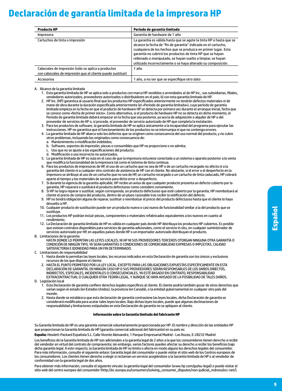 9 Declaración de garantía limitada de la impresora HP A. Alcance de la garantía limitada