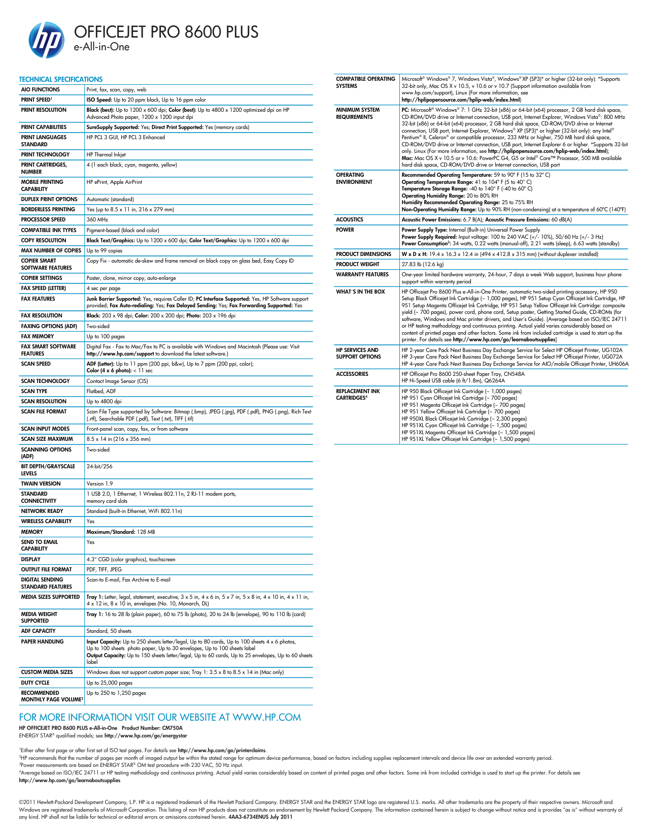 e-All-in-One HP OFFICEJET PRO 8600 PLUS e-All-in-One Product Number: CM750A ENERGY STAR® qualified models; see http://www.hp.com/go/energystar1Either after first page or after first set of ISO test pages. For details see http://www.hp.com/go/printerclaims. 2HP recommends that the number of pages per month of imaged output be within the stated range for optimum device performance, based on factors including supplies replacement intervals and device life over an extended warranty period. 3Power measurements are based on ENERGY STAR® OM test procedure with 230 VAC, 50 Hz input. 4Average based on ISO/IEC 24711 or HP testing methodology and continuous printing. Actual yield varies considerably based on content of printed pages and other factors. Some ink from included cartridge is used to start up the printer. For details see http://www.hp.com/go/learnaboutsupplies ©2011 Hewlett-Packard Development Company, L.P. HP is a registered trademark of the Hewlett Packard Company. ENERGY STAR and the ENERGY STAR logo are registered U.S. marks. All other trademarks are the property of their respective owners. Microsoft and Windows are registered trademarks of Microsoft Corporation. This listing of non HP products does not constitute an endorsement by Hewlett Packard Company. The information contained herein is subject to change without notice and is provides "as is" without warranty of any kind. HP shall not be liable for technical or editorial errors or omissions contained herein. 4AA3-6734ENUS July 2011