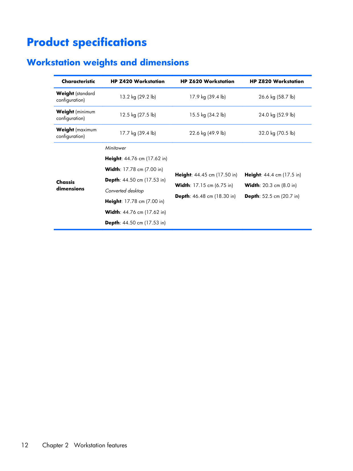 Product specifications Workstation weights and dimensions Characteristic HP Z420 Workstation HP Z620 Workstation HP Z820 Workstation Weight (standard configuration) 13.2 kg (29.2 lb) 17.9 kg (39.4 lb) 26.6 kg (58.7 lb) Weight (minimum configuration) 12.5 kg (27.5 lb) 15.5 kg (34.2 lb) 24.0 kg (52.9 lb) Weight (maximum configuration) 17.7 kg (39.4 lb) 22.6 kg (49.9 lb) 32.0 kg (70.5 lb) Chassis dimensions Minitower Height: 44.76 cm (17.62 in) Width: 17.78 cm (7.00 in) Depth: 44.50 cm (17.53 in) Converted desktop Height: 17.78 cm (7.00 in) Width: 44.76 cm (17.62 in) Depth: 44.50 cm (17.53 in) Height: 44.45 cm (17.50 in) Width: 17.15 cm (6.75 in) Depth: 46.48 cm (18.30 in) Height: 44.4 cm (17.5 in) Width: 20.3 cm (8.0 in) Depth: 52.5 cm (20.7 in) 12 Chapter 2 Workstation features