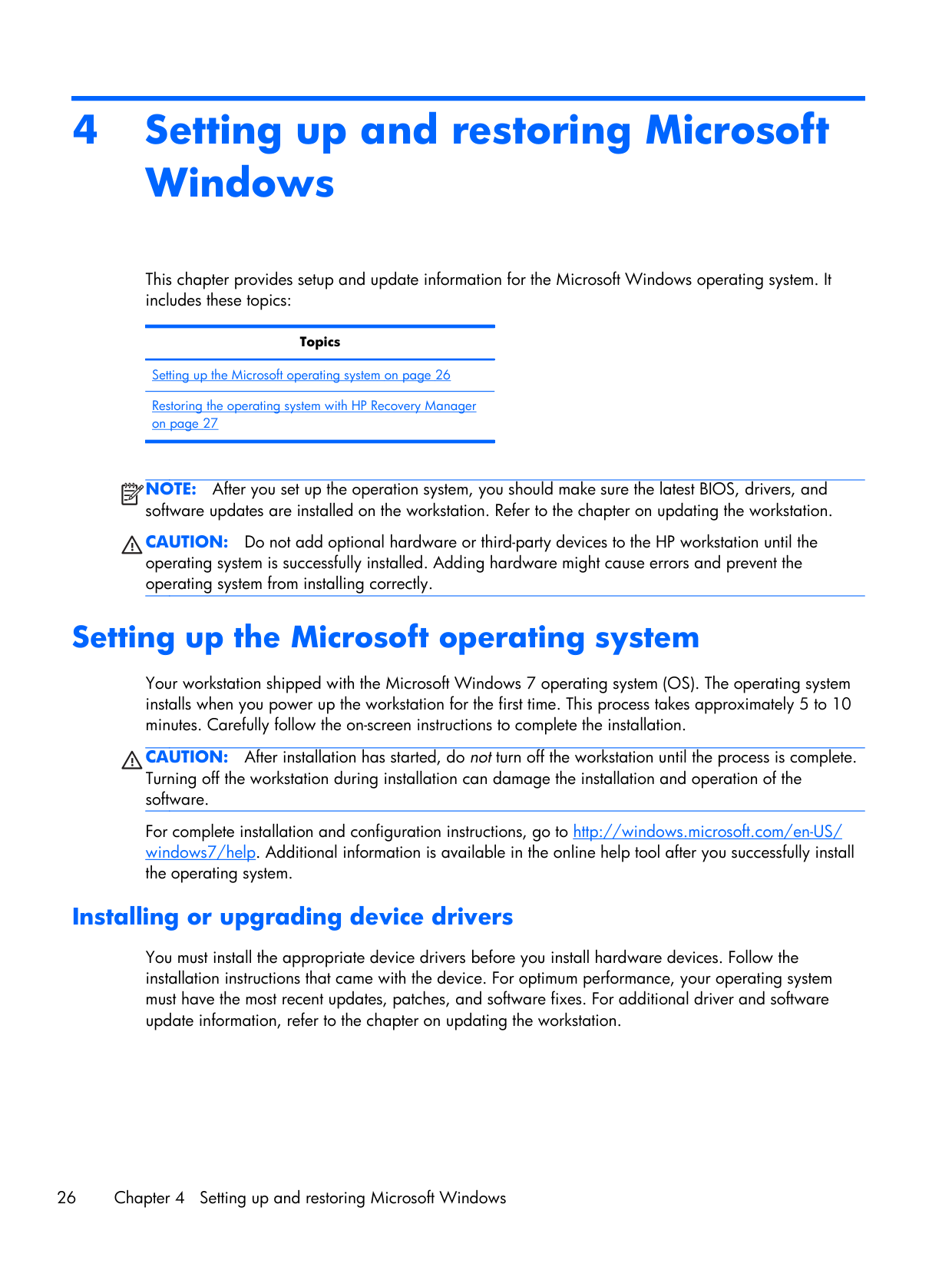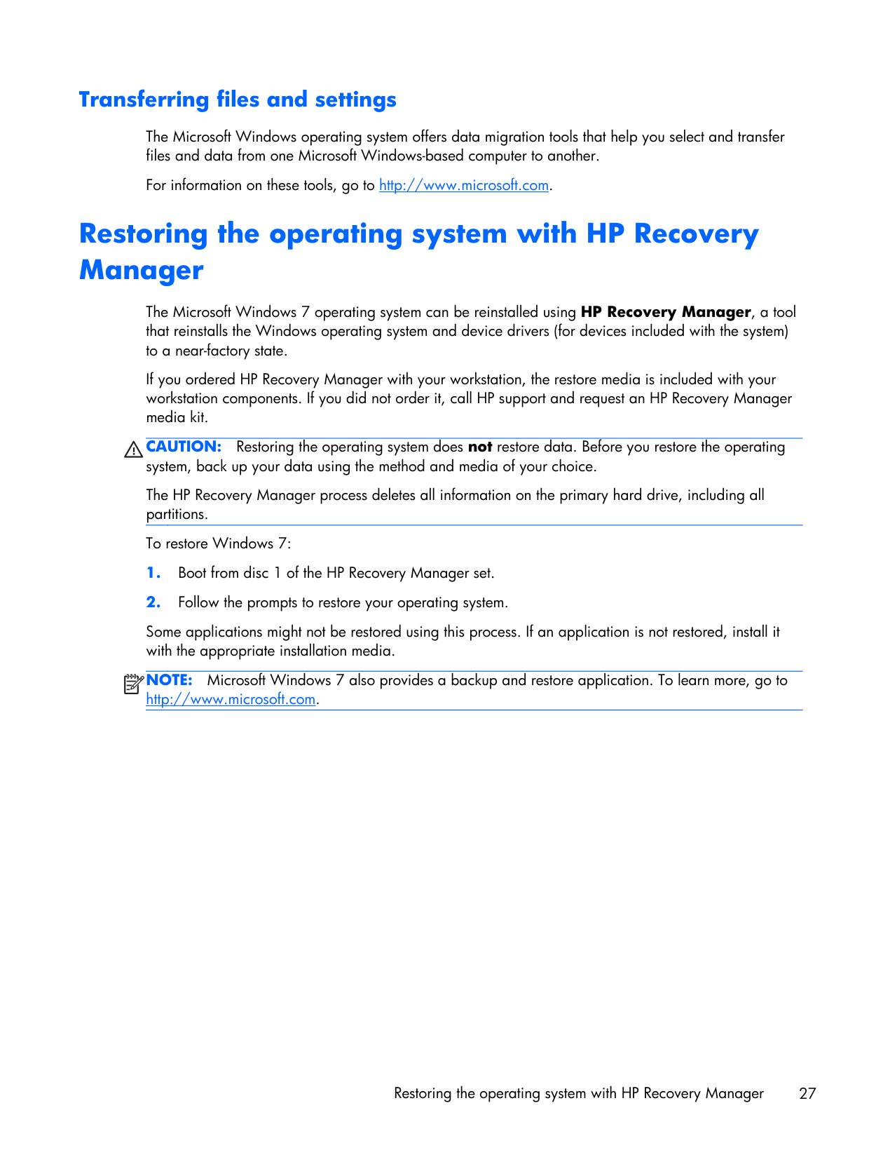After installation has started, do not turn off the workstation until the process is complete. Turning off the workstation during installation can damage the installation and operation of the software. For complete installation and configuration instructions, go to http://windows.microsoft.com/en-US/ windows7/help. Additional information is available in the online help tool after you successfully install the operating system. Installing or upgrading device drivers You must install the appropriate device drivers before you install hardware devices. Follow the installation instructions that came with the device. For optimum performance, your operating system must have the most recent updates, patches, and software fixes. For additional driver and software update information, refer to the chapter on updating the workstation. 26 Chapter 4 Setting up and restoring Microsoft WindowsTransferring files and settings The Microsoft Windows operating system offers data migration tools that help you select and transfer files and data from one Microsoft Windows-based computer to another. For information on these tools, go to http://www.microsoft.com. Restoring the operating system with HP Recovery Manager The Microsoft Windows 7 operating system can be reinstalled using HP Recovery Manager, a tool that reinstalls the Windows operating system and device drivers (for devices included with the system) to a near-factory state. If you ordered HP Recovery Manager with your workstation, the restore media is included with your workstation components. If you did not order it, call HP support and request an HP Recovery Manager media kit.