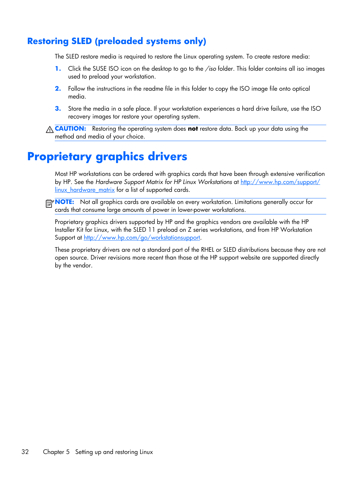 Restoring the operating system does not restore data. Back up your data using the method and media of your choice. Proprietary graphics drivers Most HP workstations can be ordered with graphics cards that have been through extensive verification by HP. See the Hardware Support Matrix for HP Linux Workstations at http://www.hp.com/support/ linux_hardware_matrix for a list of supported cards.Note: