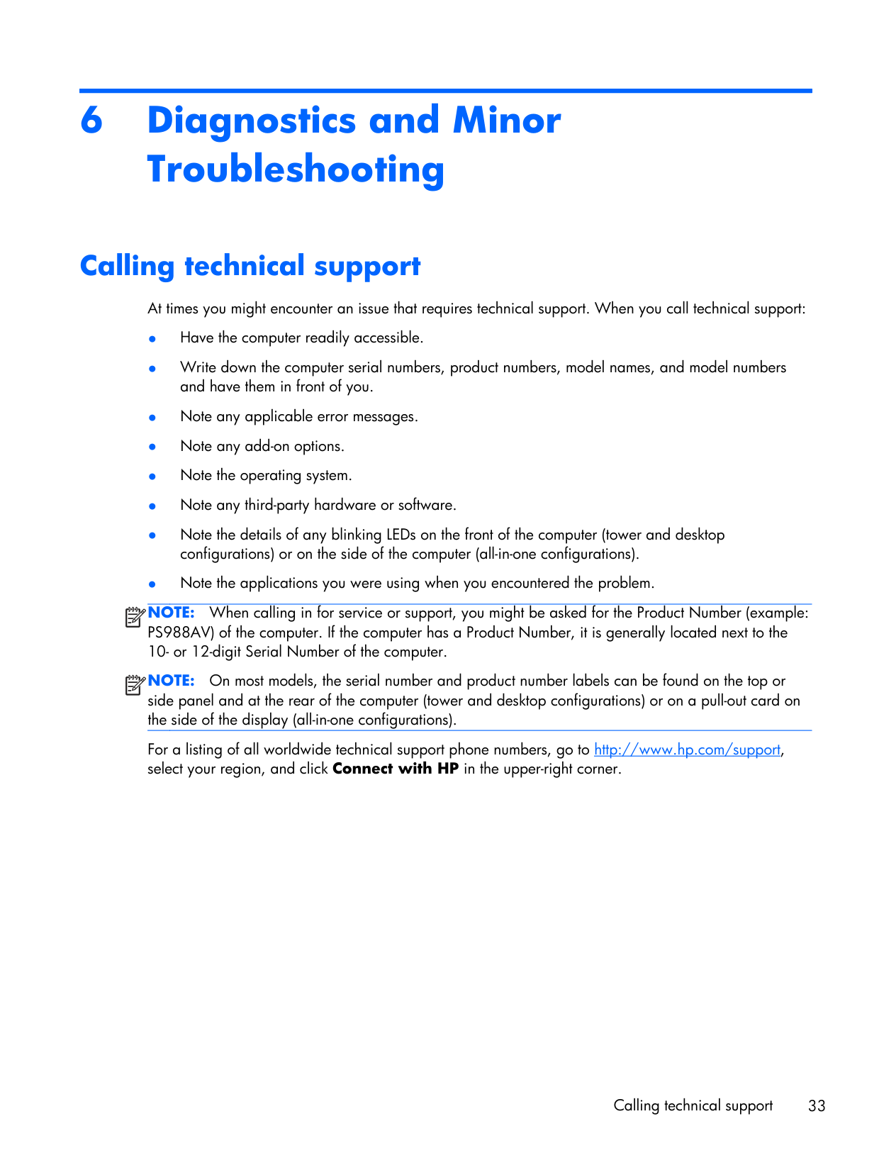 Not all graphics cards are available on every workstation. Limitations generally occur for cards that consume large amounts of power in lower-power workstations. Proprietary graphics drivers supported by HP and the graphics vendors are available with the HP Installer Kit for Linux, with the SLED 11 preload on Z series workstations, and from HP Workstation Support at http://www.hp.com/go/workstationsupport. These proprietary drivers are not a standard part of the RHEL or SLED distributions because they are not open source. Driver revisions more recent than those at the HP support website are supported directly by the vendor. 32 Chapter 5 Setting up and restoring Linux6 Diagnostics and Minor Troubleshooting Calling technical support At times you might encounter an issue that requires technical support. When you call technical support: ● Have the computer readily accessible. ● Write down the computer serial numbers, product numbers, model names, and model numbers and have them in front of you. ● Note any applicable error messages. ● Note any add-on options. ● Note the operating system. ● Note any third-party hardware or software. ● Note the details of any blinking LEDs on the front of the computer (tower and desktop configurations) or on the side of the computer (all-in-one configurations). ● Note the applications you were using when you encountered the problem.