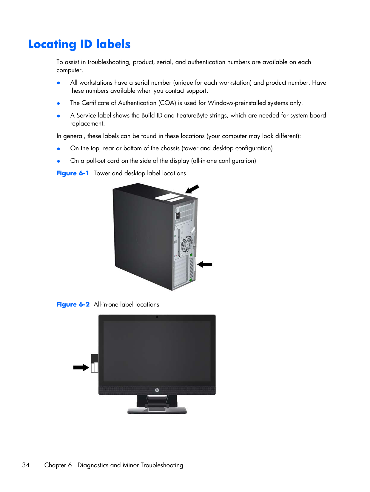 On most models, the serial number and product number labels can be found on the top or side panel and at the rear of the computer (tower and desktop configurations) or on a pull-out card on the side of the display (all-in-one configurations). For a listing of all worldwide technical support phone numbers, go to http://www.hp.com/support, select your region, and click Connect with HP in the upper-right corner. Calling technical support 33Locating ID labels To assist in troubleshooting, product, serial, and authentication numbers are available on each computer. ● All workstations have a serial number (unique for each workstation) and product number. Have these numbers available when you contact support. ● The Certificate of Authentication (COA) is used for Windows-preinstalled systems only. ● A Service label shows the Build ID and FeatureByte strings, which are needed for system board replacement. In general, these labels can be found in these locations (your computer may look different): ● On the top, rear or bottom of the chassis (tower and desktop configuration) ● On a pull-out card on the side of the display (all-in-one configuration) Figure 6-1 Tower and desktop label locations Figure 6-2 All-in-one label locations 34 Chapter 6 Diagnostics and Minor Troubleshooting