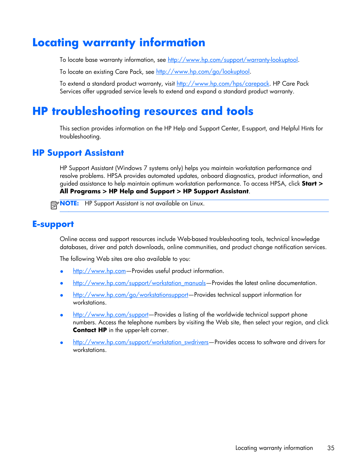 Locating warranty information To locate base warranty information, see http://www.hp.com/support/warranty-lookuptool. To locate an existing Care Pack, see http://www.hp.com/go/lookuptool. To extend a standard product warranty, visit http://www.hp.com/hps/carepack. HP Care Pack Services offer upgraded service levels to extend and expand a standard product warranty. HP troubleshooting resources and tools This section provides information on the HP Help and Support Center, E-support, and Helpful Hints for troubleshooting. HP Support Assistant HP Support Assistant (Windows 7 systems only) helps you maintain workstation performance and resolve problems. HPSA provides automated updates, onboard diagnostics, product information, and guided assistance to help maintain optimum workstation performance. To access HPSA, click Start > All Programs > HP Help and Support > HP Support Assistant.
