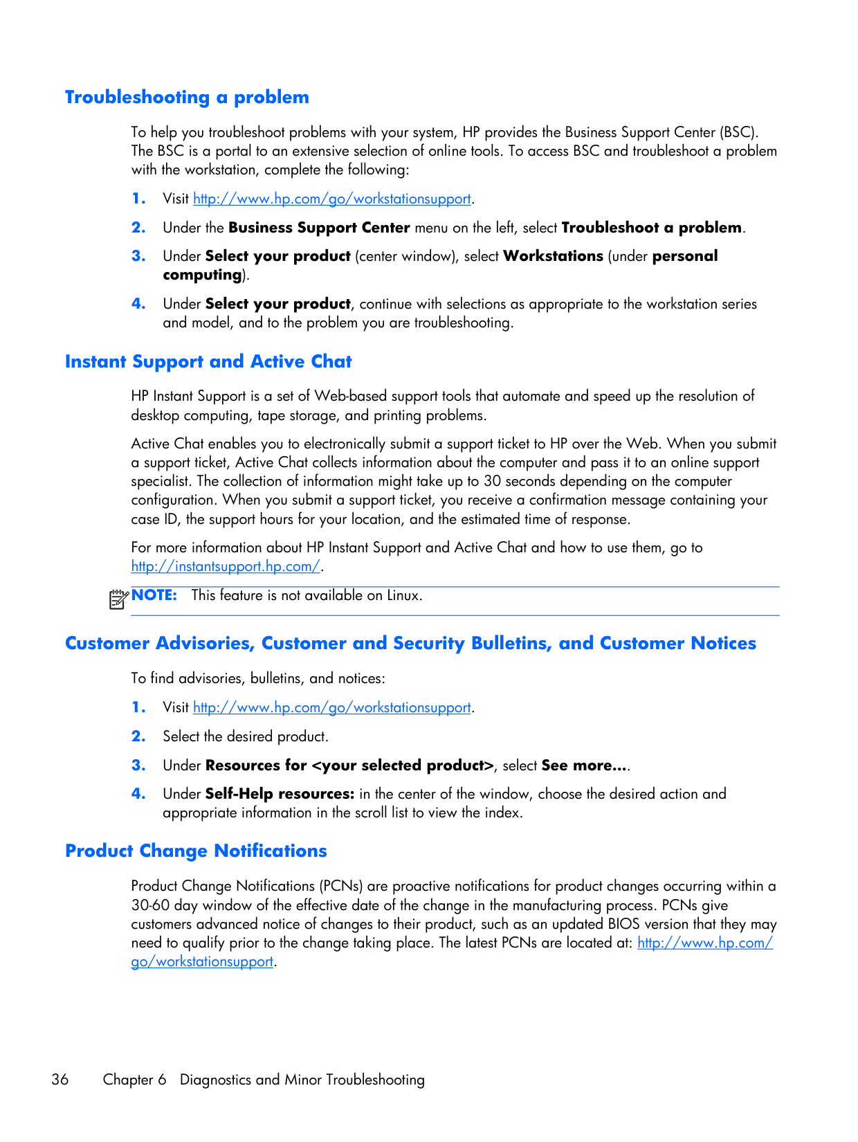 HP Support Assistant is not available on Linux. E-support Online access and support resources include Web-based troubleshooting tools, technical knowledge databases, driver and patch downloads, online communities, and product change notification services. The following Web sites are also available to you: ● http://www.hp.com—Provides useful product information. ● http://www.hp.com/support/workstation_manuals—Provides the latest online documentation. ● http://www.hp.com/go/workstationsupport—Provides technical support information for workstations. ● http://www.hp.com/support—Provides a listing of the worldwide technical support phone numbers. Access the telephone numbers by visiting the Web site, then select your region, and click Contact HP in the upper-left corner. ● http://www.hp.com/support/workstation_swdrivers—Provides access to software and drivers for workstations. Locating warranty information 35Troubleshooting a problem To help you troubleshoot problems with your system, HP provides the Business Support Center (BSC). The BSC is a portal to an extensive selection of online tools. To access BSC and troubleshoot a problem with the workstation, complete the following: