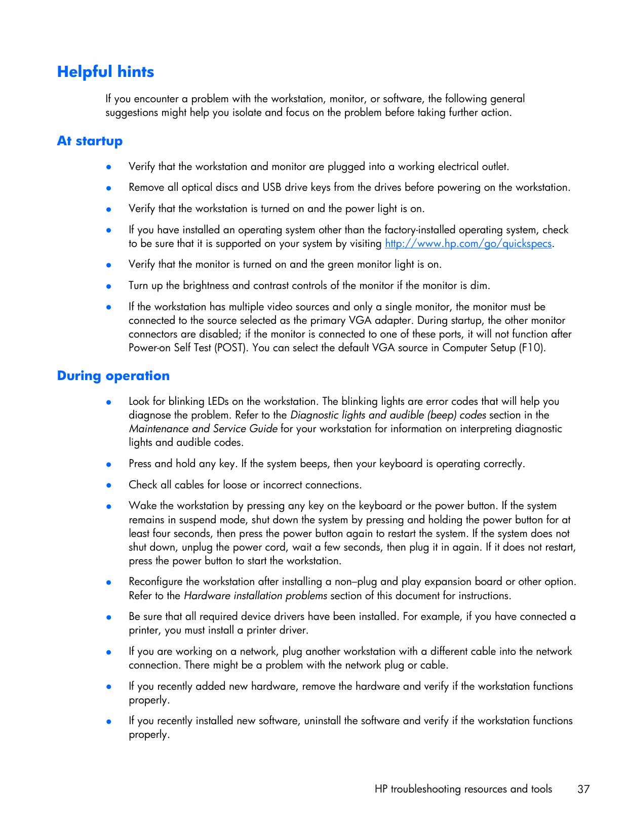 This feature is not available on Linux. Customer Advisories, Customer and Security Bulletins, and Customer Notices To find advisories, bulletins, and notices:Helpful hints If you encounter a problem with the workstation, monitor, or software, the following general suggestions might help you isolate and focus on the problem before taking further action. At startup ● Verify that the workstation and monitor are plugged into a working electrical outlet. ● Remove all optical discs and USB drive keys from the drives before powering on the workstation. ● Verify that the workstation is turned on and the power light is on. ● If you have installed an operating system other than the factory-installed operating system, check to be sure that it is supported on your system by visiting http://www.hp.com/go/quickspecs. ● Verify that the monitor is turned on and the green monitor light is on. ● Turn up the brightness and contrast controls of the monitor if the monitor is dim. ● If the workstation has multiple video sources and only a single monitor, the monitor must be connected to the source selected as the primary VGA adapter. During startup, the other monitor connectors are disabled; if the monitor is connected to one of these ports, it will not function after Power-on Self Test (POST). You can select the default VGA source in Computer Setup (F10). During operation ● Look for blinking LEDs on the workstation. The blinking lights are error codes that will help you diagnose the problem. Refer to the Diagnostic lights and audible (beep) codes section in the Maintenance and Service Guide for your workstation for information on interpreting diagnostic lights and audible codes. ● Press and hold any key. If the system beeps, then your keyboard is operating correctly. ● Check all cables for loose or incorrect connections. ● Wake the workstation by pressing any key on the keyboard or the power button. If the system remains in suspend mode, shut down the system by pressing and holding the power button for at least four seconds, then press the power button again to restart the system. If the system does not shut down, unplug the power cord, wait a few seconds, then plug it in again. If it does not restart, press the power button to start the workstation. ● Reconfigure the workstation after installing a non–plug and play expansion board or other option. Refer to the Hardware installation problems section of this document for instructions. ● Be sure that all required device drivers have been installed. For example, if you have connected a printer, you must install a printer driver. ● If you are working on a network, plug another workstation with a different cable into the network connection. There might be a problem with the network plug or cable. ● If you recently added new hardware, remove the hardware and verify if the workstation functions properly. ● If you recently installed new software, uninstall the software and verify if the workstation functions properly. HP troubleshooting resources and tools 37