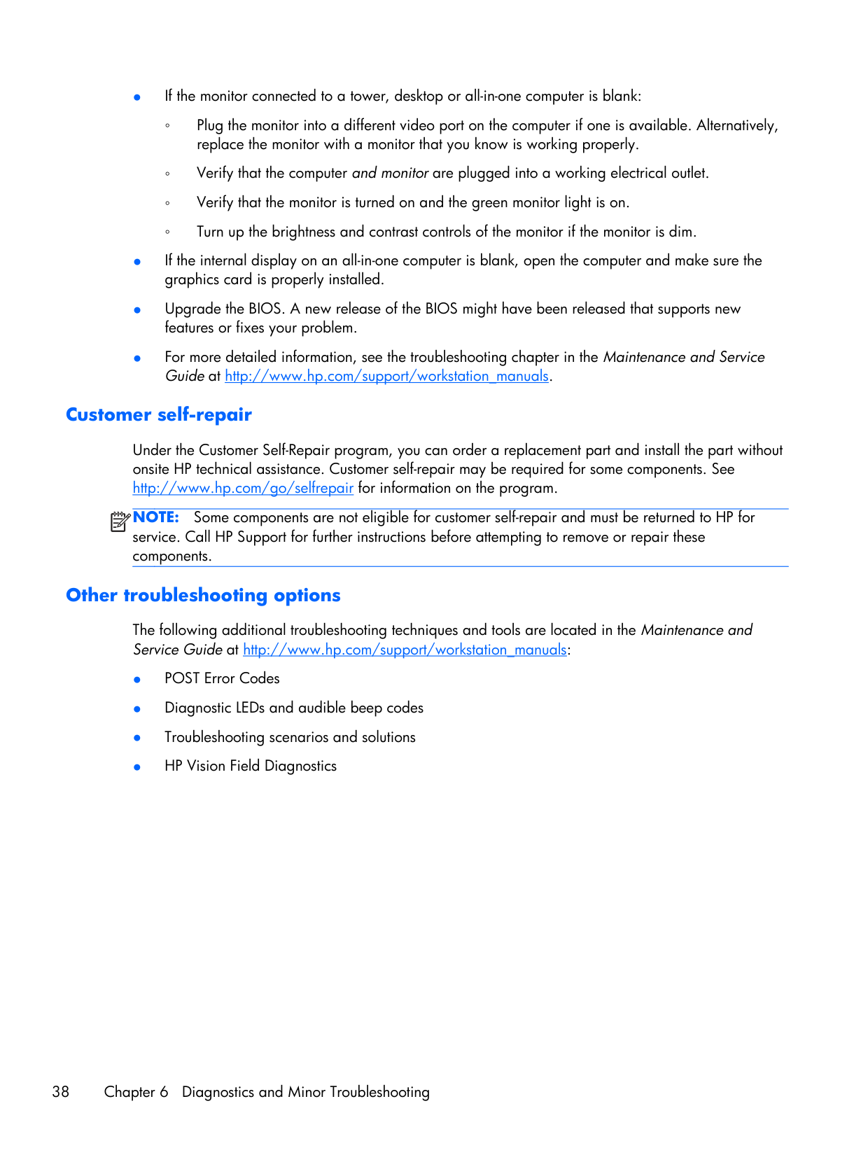 ● If the monitor connected to a tower, desktop or all-in-one computer is blank: ◦ Plug the monitor into a different video port on the computer if one is available. Alternatively, replace the monitor with a monitor that you know is working properly. ◦ Verify that the computer and monitor are plugged into a working electrical outlet. ◦ Verify that the monitor is turned on and the green monitor light is on. ◦ Turn up the brightness and contrast controls of the monitor if the monitor is dim. ● If the internal display on an all-in-one computer is blank, open the computer and make sure the graphics card is properly installed. ● Upgrade the BIOS. A new release of the BIOS might have been released that supports new features or fixes your problem. ● For more detailed information, see the troubleshooting chapter in the Maintenance and Service Guide at http://www.hp.com/support/workstation_manuals. Customer self-repair Under the Customer Self-Repair program, you can order a replacement part and install the part without onsite HP technical assistance. Customer self-repair may be required for some components. See http://www.hp.com/go/selfrepair for information on the program.