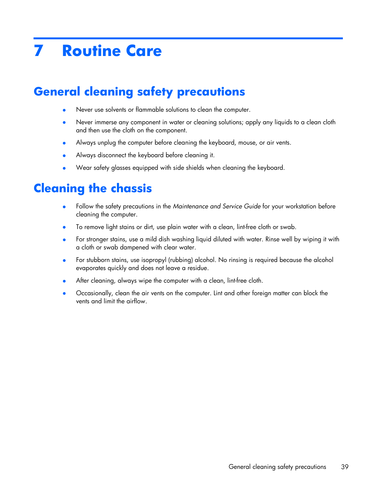 Some components are not eligible for customer self-repair and must be returned to HP for service. Call HP Support for further instructions before attempting to remove or repair these components. Other troubleshooting options The following additional troubleshooting techniques and tools are located in the Maintenance and Service Guide at http://www.hp.com/support/workstation_manuals: ● POST Error Codes ● Diagnostic LEDs and audible beep codes ● Troubleshooting scenarios and solutions ● HP Vision Field Diagnostics 38 Chapter 6 Diagnostics and Minor Troubleshooting7 Routine Care General cleaning safety precautions ● Never use solvents or flammable solutions to clean the computer. ● Never immerse any component in water or cleaning solutions; apply any liquids to a clean cloth and then use the cloth on the component. ● Always unplug the computer before cleaning the keyboard, mouse, or air vents. ● Always disconnect the keyboard before cleaning it. ● Wear safety glasses equipped with side shields when cleaning the keyboard. Cleaning the chassis ● Follow the safety precautions in the Maintenance and Service Guide for your workstation before cleaning the computer. ● To remove light stains or dirt, use plain water with a clean, lint-free cloth or swab. ● For stronger stains, use a mild dish washing liquid diluted with water. Rinse well by wiping it with a cloth or swab dampened with clear water. ● For stubborn stains, use isopropyl (rubbing) alcohol. No rinsing is required because the alcohol evaporates quickly and does not leave a residue. ● After cleaning, always wipe the computer with a clean, lint-free cloth. ● Occasionally, clean the air vents on the computer. Lint and other foreign matter can block the vents and limit the airflow. General cleaning safety precautions 39