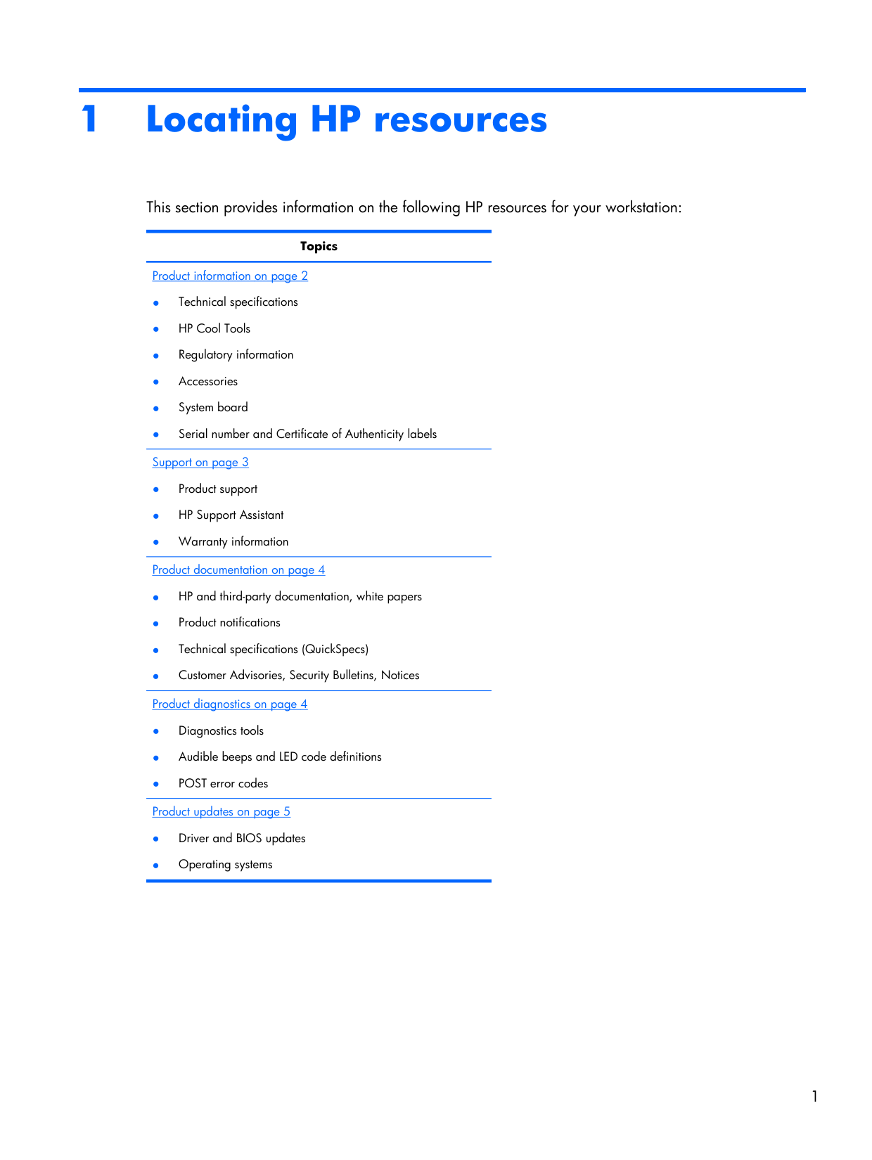 1 Locating HP resources This section provides information on the following HP resources for your workstation: Topics Product information on page 2 ● Technical specifications ● HP Cool Tools ● Regulatory information ● Accessories ● System board ● Serial number and Certificate of Authenticity labels Support on page 3 ● Product support ● HP Support Assistant ● Warranty information Product documentation on page 4 ● HP and third-party documentation, white papers ● Product notifications ● Technical specifications (QuickSpecs) ● Customer Advisories, Security Bulletins, Notices Product diagnostics on page 4 ● Diagnostics tools ● Audible beeps and LED code definitions ● POST error codes Product updates on page 5 ● Driver and BIOS updates ● Operating systems 1