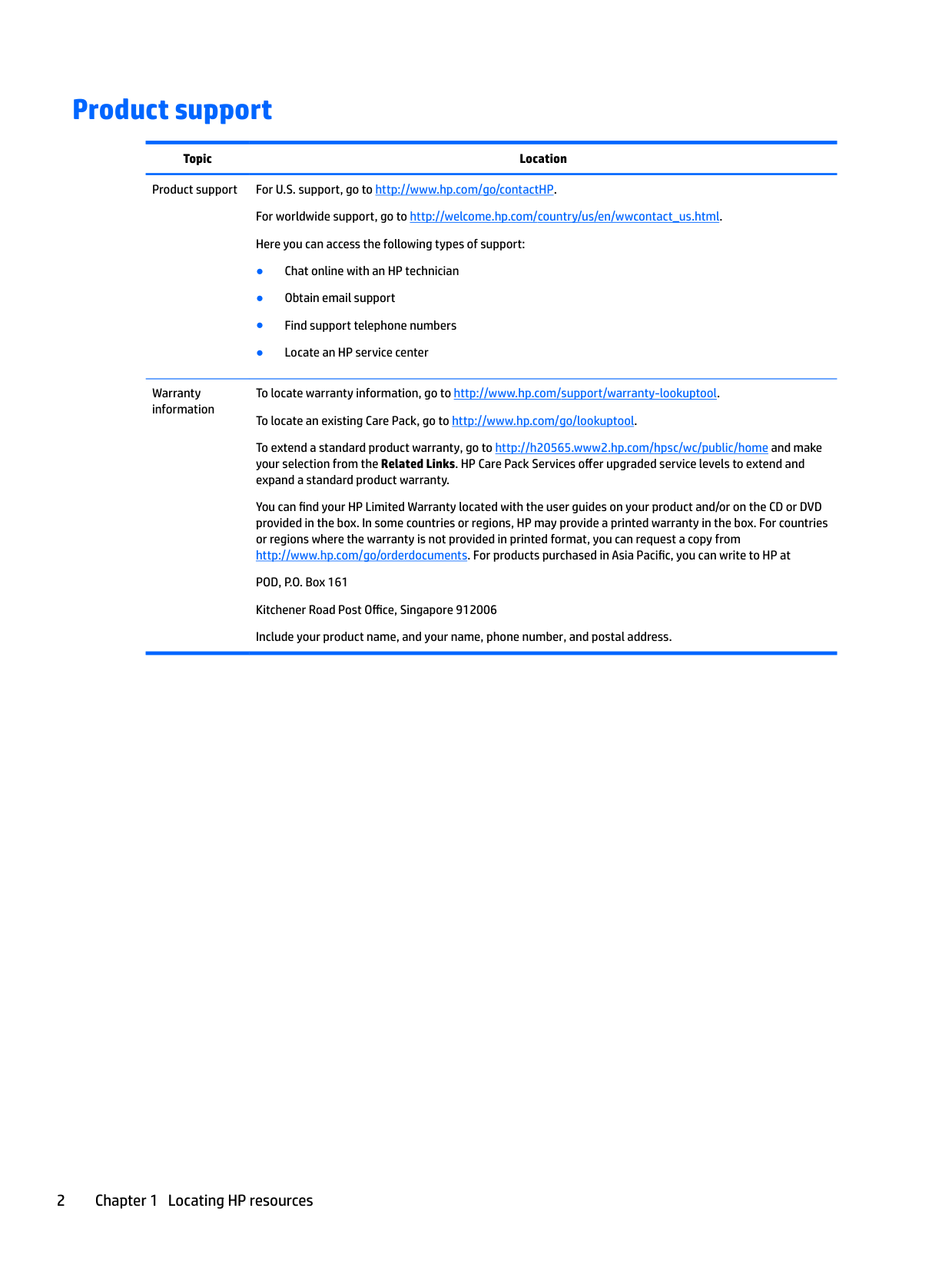 Product support Topic Location Product support For U.S. support, go to http://www.hp.com/go/contactHP. For worldwide support, go to http://welcome.hp.com/country/us/en/wwcontact_us.html. Here you can access the following types of support: ● Chat online with an HP technician ● Obtain email support ● Find support telephone numbers ● Locate an HP service center Warranty information To locate warranty information, go to http://www.hp.com/support/warranty-lookuptool. To locate an existing Care Pack, go to http://www.hp.com/go/lookuptool. To extend a standard product warranty, go to http://h20565.www2.hp.com/hpsc/wc/public/home and make your selection from the Related Links. HP Care Pack Services offer upgraded service levels to extend and expand a standard product warranty. You can find your HP Limited Warranty located with the user guides on your product and/or on the CD or DVD provided in the box. In some countries or regions, HP may provide a printed warranty in the box. For countries or regions where the warranty is not provided in printed format, you can request a copy from http://www.hp.com/go/orderdocuments. For products purchased in Asia Pacific, you can write to HP at POD, P.O. Box 161 Kitchener Road Post Office, Singapore 912006 Include your product name, and your name, phone number, and postal address. 2 Chapter 1 Locating HP resources